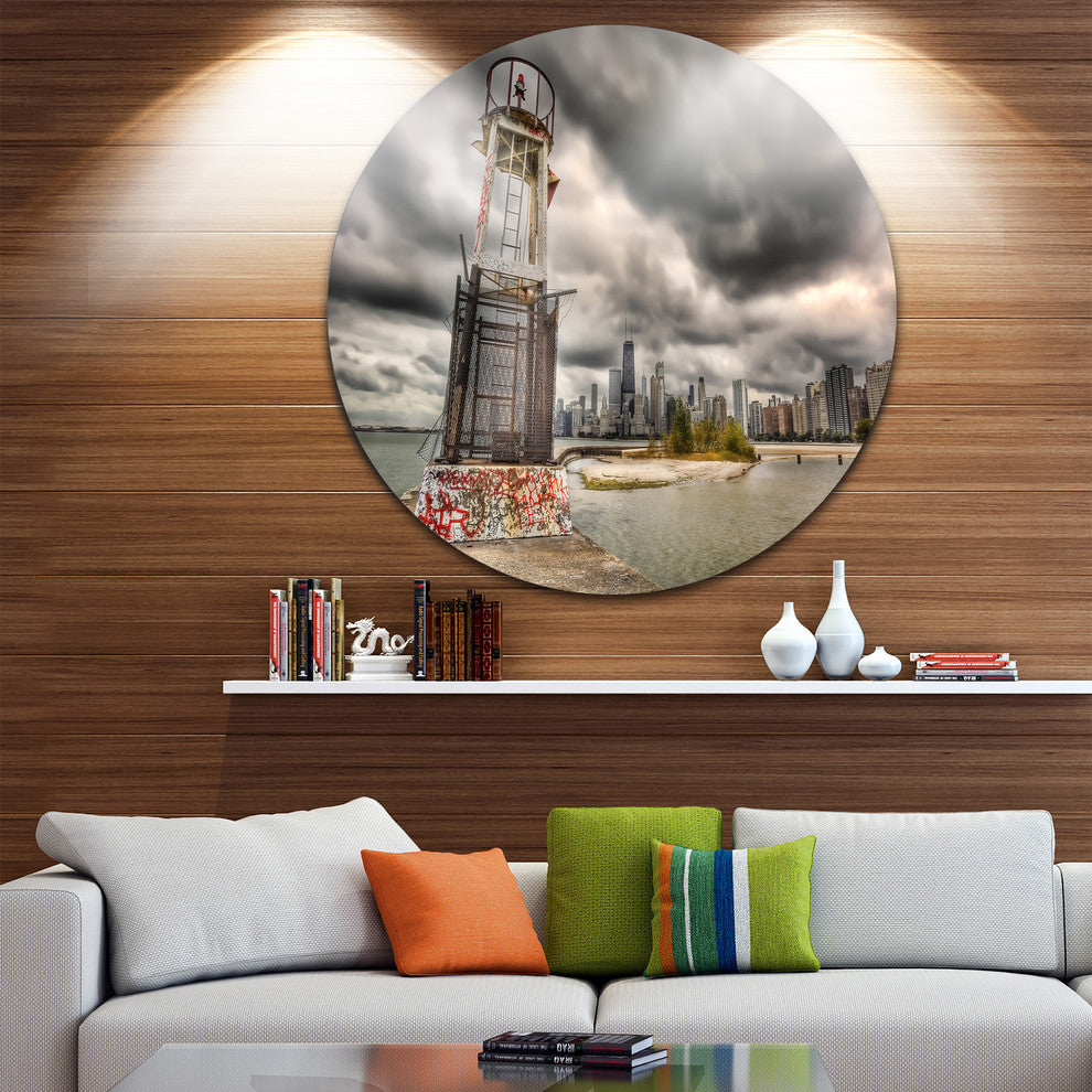 Lake Michigan Navigation Light, Cityscape Disc Metal Artwork, 11"