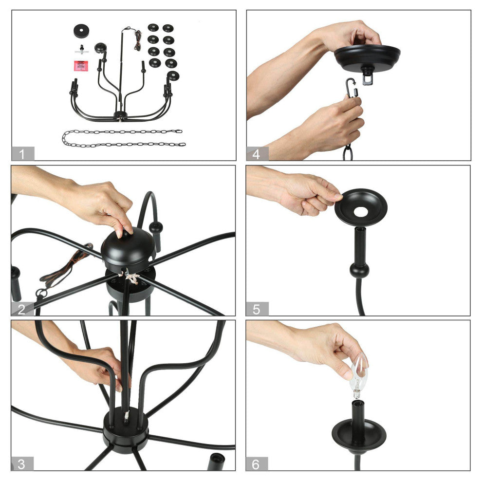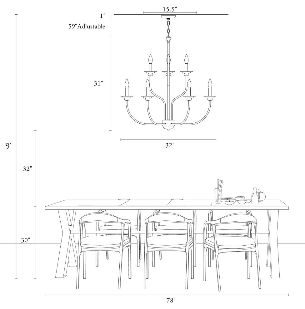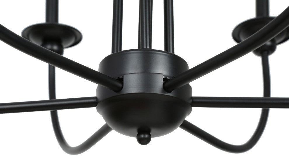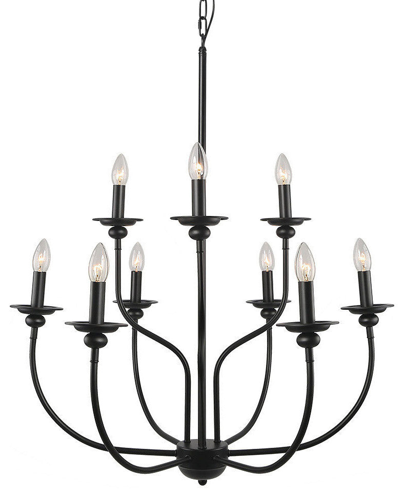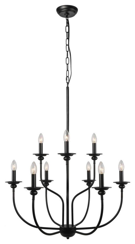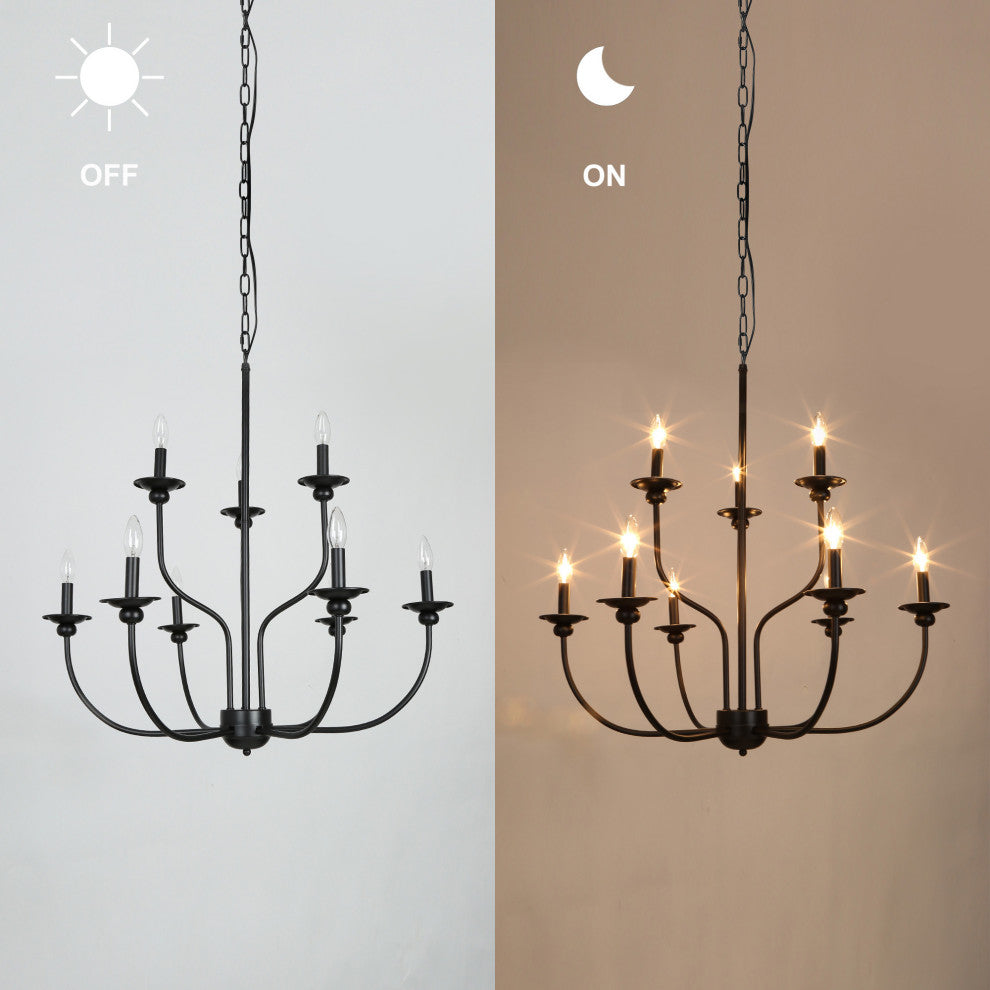 This understated 9-light 2-tier modern farmhouse matte black large candle chandelier features an elegant design. Its iron arms extend confidently from a sphere and are topped with traditional candles sticks. With a rich black finish, it complements a touch of modern, farmhouse, rustic, vintage, transitional, mid-century and traditional feeling for your dining room, kitchen, bedroom, living room, foyer and entrance, etc.Features:Model: 3AFNE2HZ2H6Material: MetalColor: BlackStyle: FarmhouseFinish: Matte BlackProduct Dimension: 30"W x 30"D x 32"H(exclude the hanging height)Canopy Dimension: 5"D x 1"HShade Material: MetalShade Color: BlackShade Shape: Candle-StyleCompatible ceiling types: flat, sloped, slanted and vaulted ceilings Type of Drop: Downrod/ChainMaximum Hanging Height: 93"Minimum Hanging Height: 34"Adjustable Height: YesLocation: DryDimmable: Yes, when used with dimmer switch and dimmable bulbsKey Features: Bulb Type: B10 LED/Incandescent Bulb Base: E-12 Maximum Wattage: 40W Number of Bulb: 9 Bulb Included: N Voltage: 120V Mount Type: Ceiling Mounts Assembly Required: Yes Mounting Accessory Included: Yes Certification: ETL Listed Power Source: HardwiredProfessional installation recommended