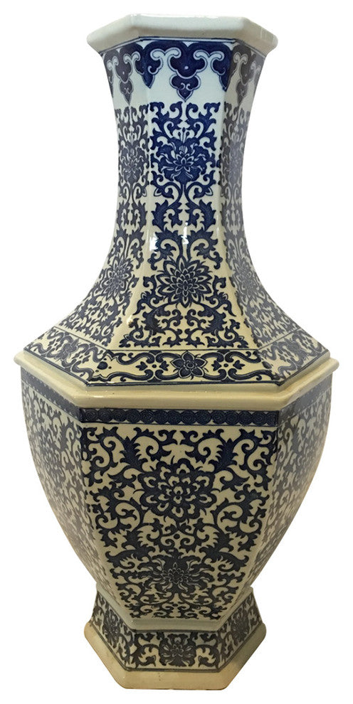 Let this 22" high hexagonal vase become the center piece in your room. Blue and white floral glazed can be used as the focal point in any decor plan. In the entry of the home, or on flower stands in a room corner or as bookends. Add a floral blue and white Asian touch in your design plans. Use indoors or outdoors as a flower vase or simply a a object of art.. Adored with vine, flowers and leaves to make a rhythmic design painted in cobalt blue on white background. Imported from China ,made in the ancient porcelain capital of Jingdezhen. Add this Blue and white design, for some color and simplicity. This vase is water tight can be used on the floor or on a table top. We suggest a wooden stand to enhance its beauty. This handmade item is rare at this price and limited in supply. • 12 x 12 x 22H • Base 7 x 7,Hex. • Opening 4.5 X 4.5 • Rare, Caved 3 ring pattern • Water tight, glazed painting. • Indoor or Outdoor use • Chinese porcelain