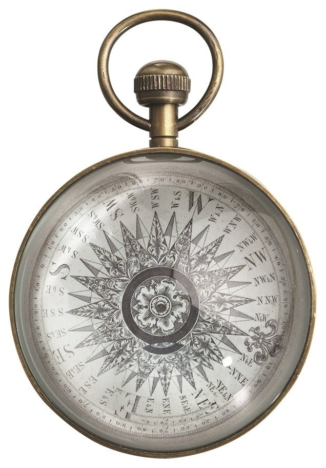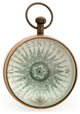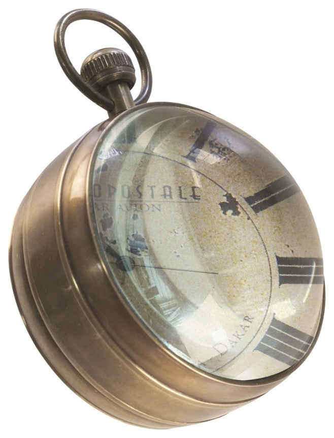 The large library eye of time clock measures 3" x 4.5". The hero of our story is an anonymous watchmaker in Regency London. Trying to combine a travel clock that needs to be small while easy to read... The epoque was candle light... little would he know that his spherical desk watch would be a highly collectable treasure. In times of need the lenses doubled to read maps and light the safari-cooking fire.