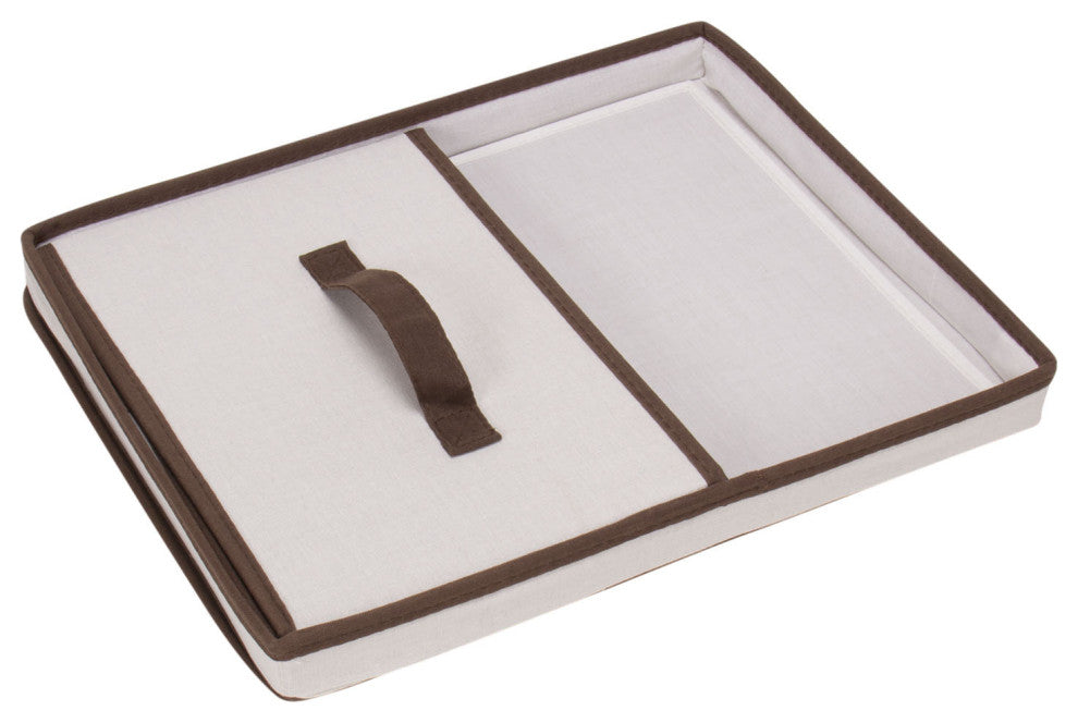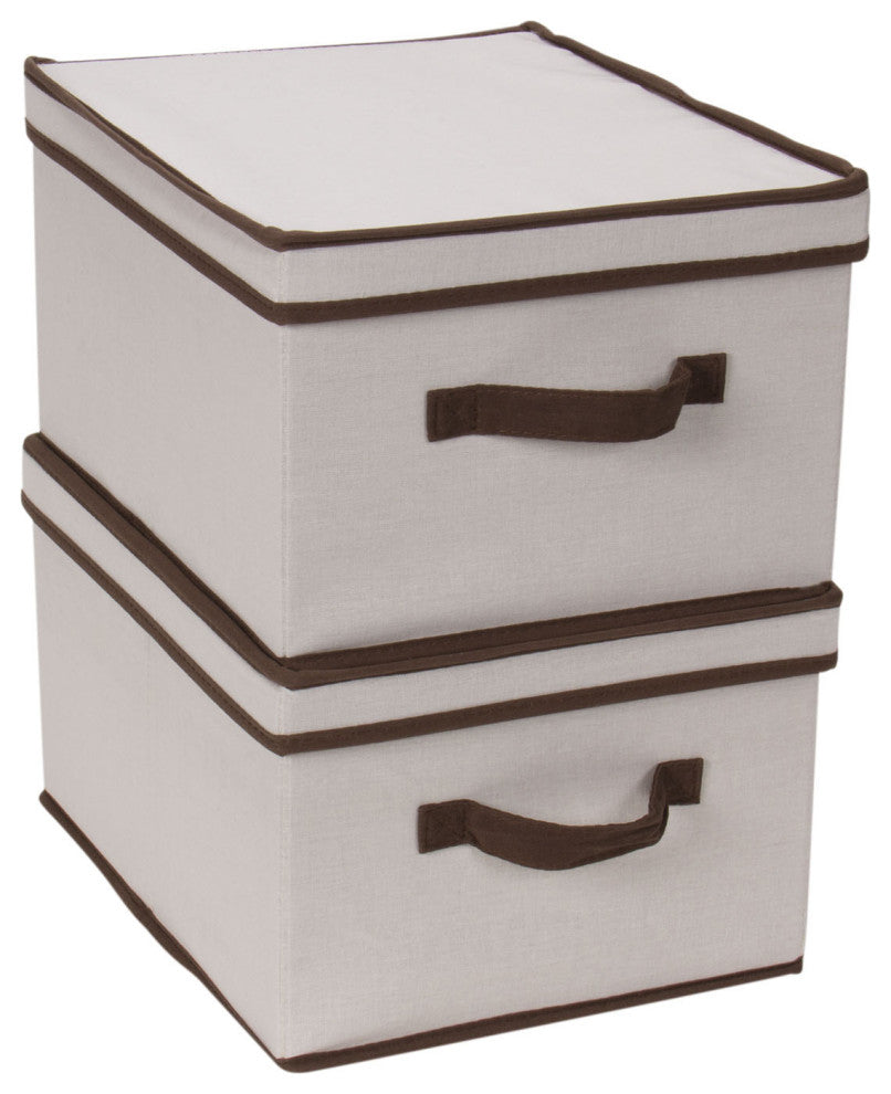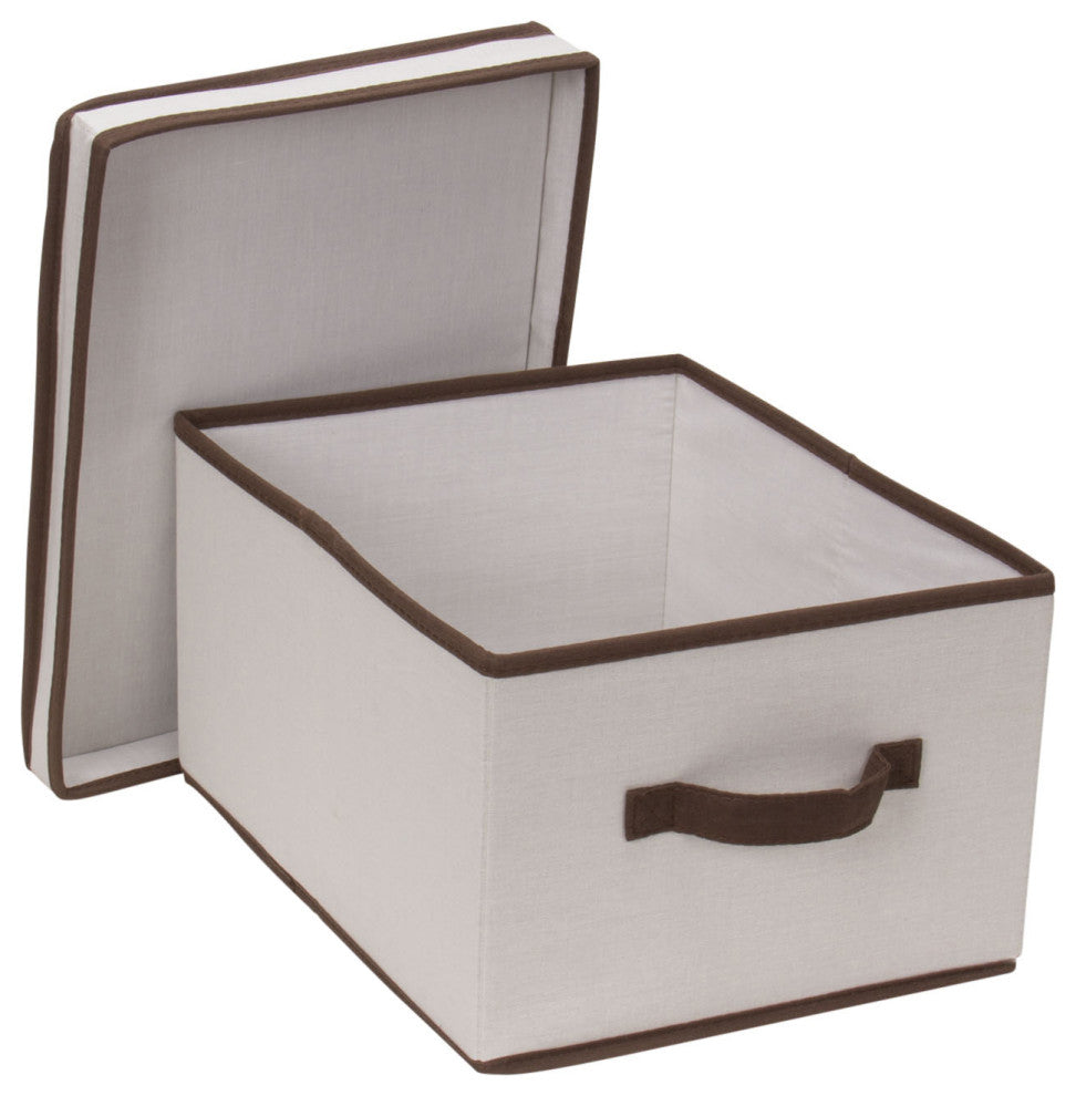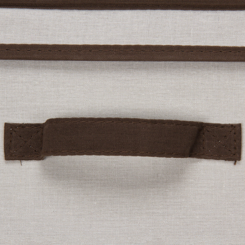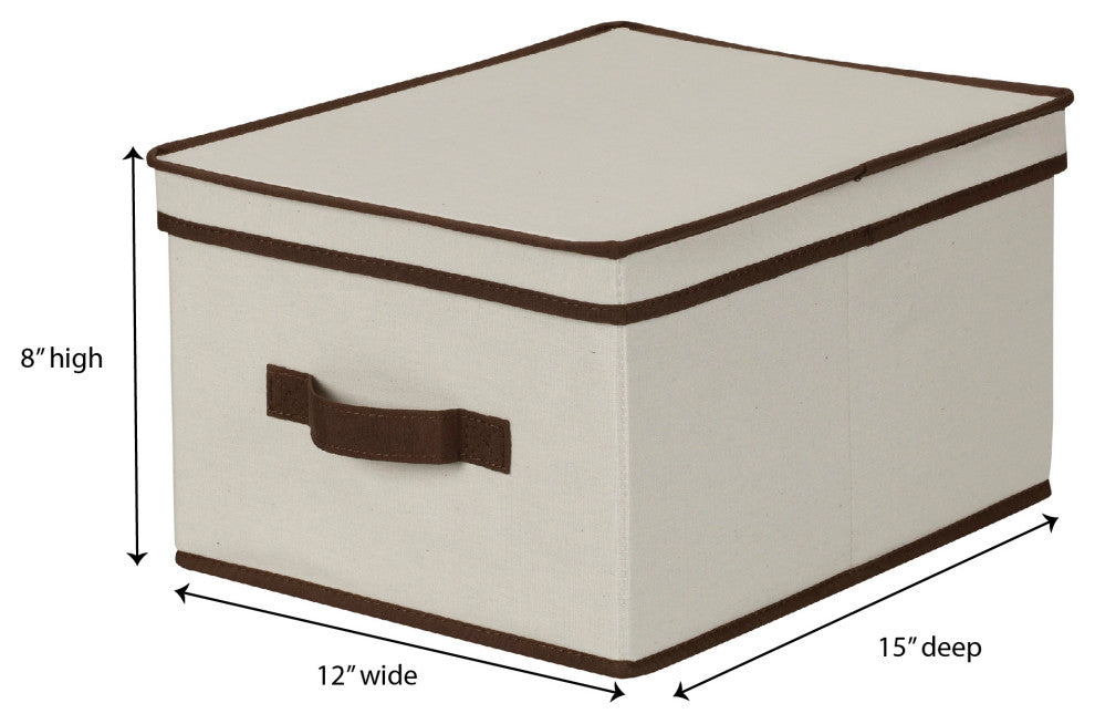 Stylish and versatile, this large storage box with lid will help you keep any room of the home neat and organized. This natural storage box with an attractive coffee trim can be used to store a wide variety of items and blends well with any pre-existing room design. Unlike similar storage options, this storage box balances classic style and functionality the best. This durable storage box is made of soft poly-cotton canvas with a reinforced frame to provide high-quality support and protection. The smooth canvas resists snagging and encourages breathability for fresh-smelling storage. Easily grab what you need and store what you don''t by using the convenient front handle and snug-fitting lid. This lid protects from dust, dirt or grime and keeps the contents contained. The decorative tubing along the edges also creates a subtle but elegant appearance�the perfect addition to your closet and decor! The reinforced frame allows multiple storage boxes to be stacked for ultimate storage optimization. This durable frame can also be folded down and nestled into the bottom of the lid for convenient self-storage in between uses. This storage box is made deep with a large capacity to hold a variety of items such as bathroom towels, magazines, scarves, hats, belts and much more. This large storage box is great for anyone who enjoys versatile storage solutions. Add this storage box to the office to hold writing supplies, the crafts room to hold yarn, the bedroom to organize pillowcases or the bathroom to hold extra soaps! The space-saving and charming qualities of this large storage bin with lid would be the perfect fit for dorms, apartments, townhouses and any home in need of decorative storage options.