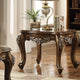 Graceful curves define every aspect of a traditional square end table. Beautiful in a sophisticated sitting area, the table pairs a rich antique walnut finish with hand-brushed, carved motifs that bring compelling dimensionality and classic elegance. A scalloped tabletop is perfectly complemented with a curved apron a graceful Queen Anne legs for stable, stylish support. Add a gorgeous table lamp to create a warm and inviting sitting area in your den or living room.Features:•  Square table top•  Wooden scalloped top.•  Wooden Queen Anne leg.•  Wooden apron with hand-brushed motifsFinish: Antique Oak FinishMaterial: Wood, Composite WoodDimensions:Product Dimensions: 30"L X 30"W X 24"HNet Weight: 53 lbsPackage Dimensions: 30.3"L X 30.3"W X 9.1"HGross Weight: 57 lbsPackage Type: CARTONShip Type: GROUND