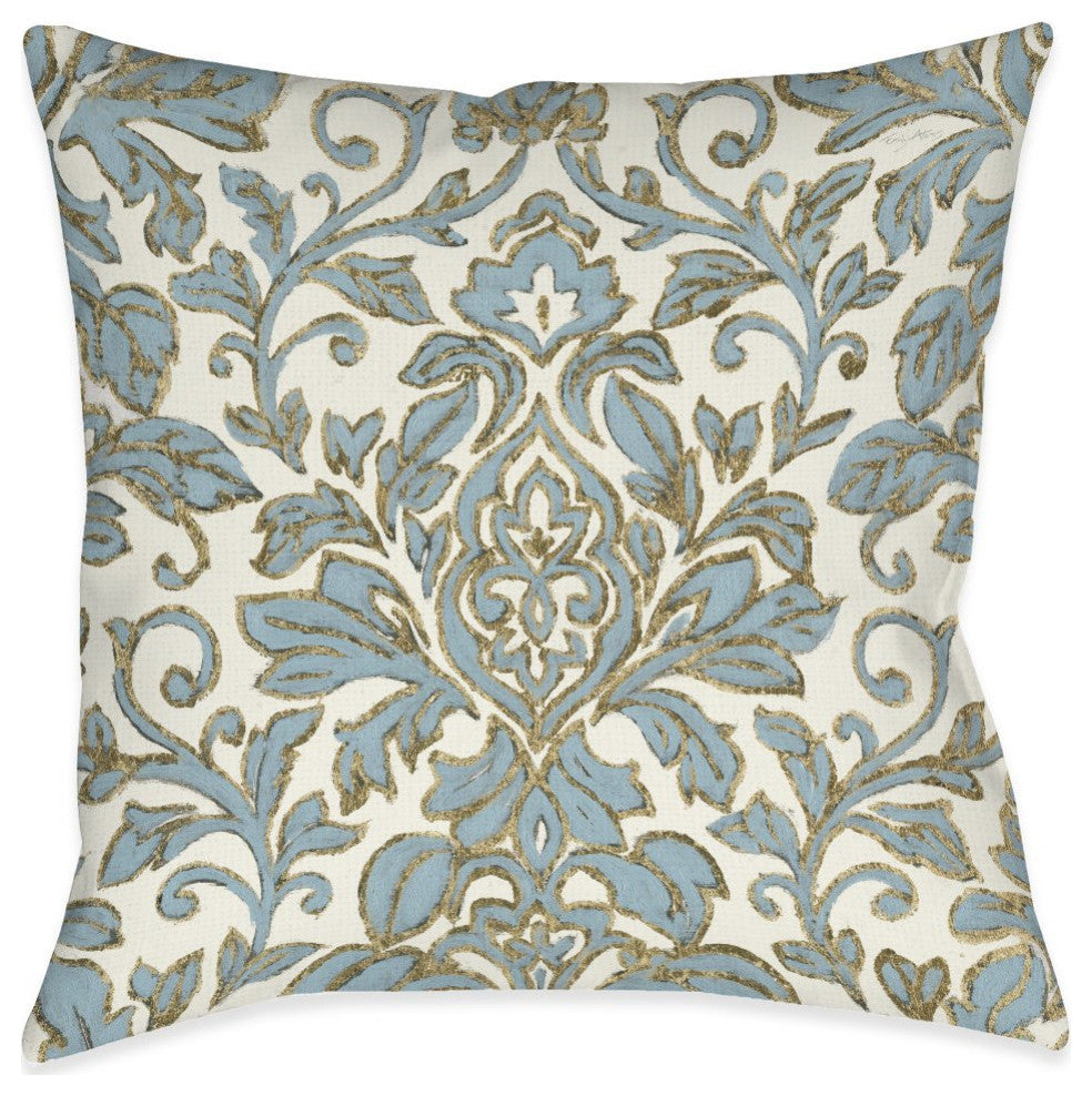 This classic damask pattern decorative pillow, "Antique Damask" creates a luxury piece for any room. Throughout is painterly pale blue brush strokes with gold foil accents design on cream background. This decorative pillow will bring a victorian aesthetic to any home.
