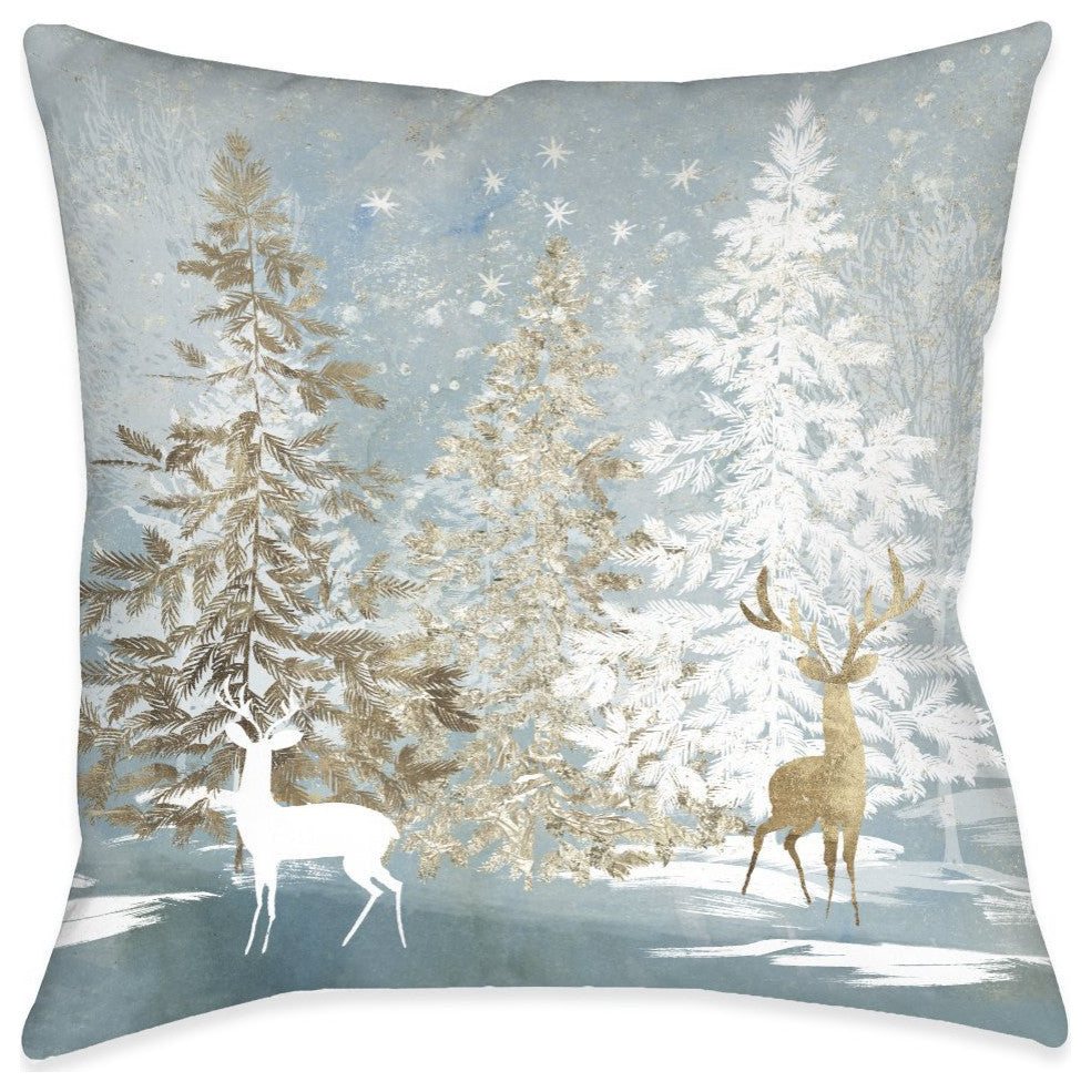 This seasonal themed indoor pillow, "Winter Wonderland" features an elegant wintertime scene. Gold and white colors highlight deer and pine trees, which are set against an icy blue background and falling snow. Add this beautiful design to your home for the perfect seasonal look!