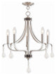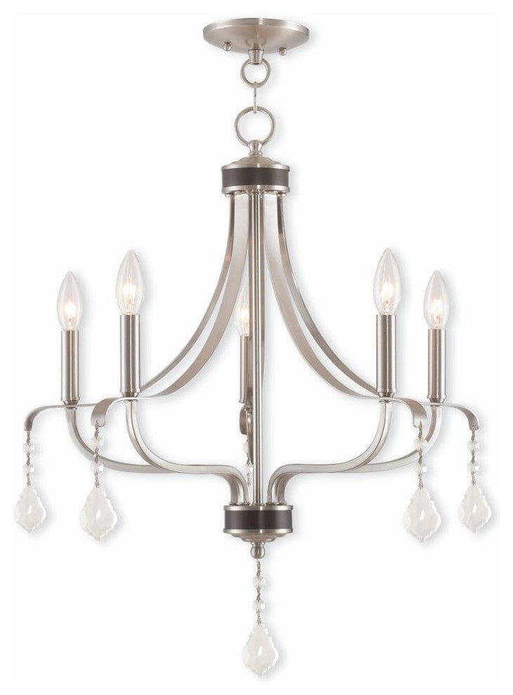 Faceted clear crystals drop beautifully from the transitional, scrolling form of this five light chandelier. The design is beautiful and appealing, with a brushed nickel finish. This chandelier is perfect for any room in your house.