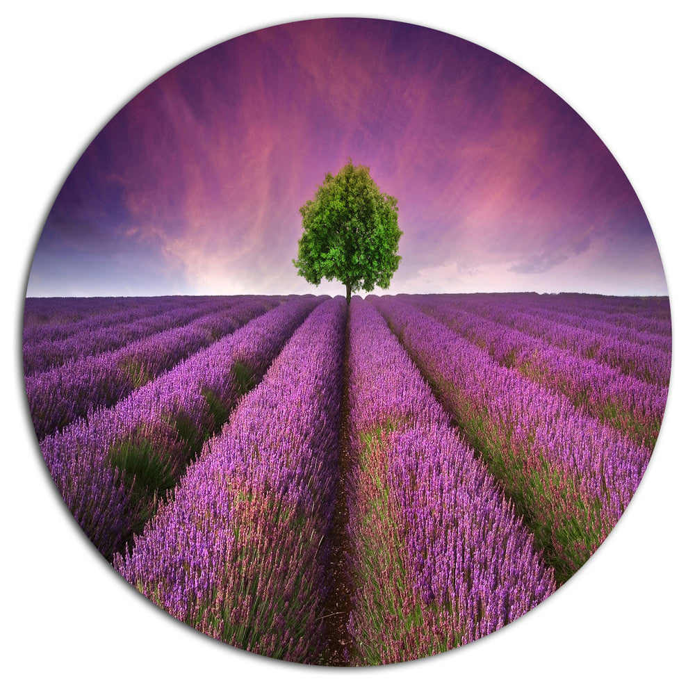 Lavender Field Sunset With Single Tree, Floral Disc Metal Artwork, 36"