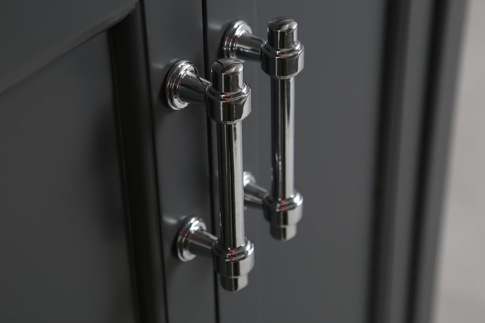 Give your bathroom a stunning upgrade! This sleek vanity features a simple design with quality craftsmanship for a contemporary style. Made of poplar and MDF in a dark gray finish, its two doors provide ample storage for optimum functionality. A white porcelain top and integrated white porcelain sink add elegance to any modern bathroom. It comes with three pre-drilled holes for a 4" faucet (faucet not included). Some assembly is required, and professional installation is recommended.