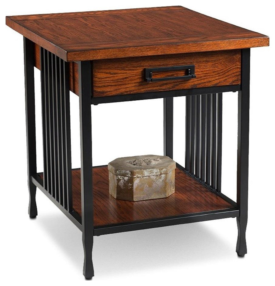 The Ironcraft Drawer End Table in Mahogany blends the familiar with something fresh and new. It features rich, wood tones over matte black steel bases. The end table includes storage in a pull out drawer and a lower display shelf. The traditional mission slats are echoed in a contemporary, two-piece custom drawer pull. A solid wood drawer box opens completely on ball-bearing roller guides for easy use. It is finished in Burnished Medium Oak and is easy to assemble.Features: • Distinctive Rustic Charm The 22in L x 24in W x 24in H Ironcraft End Table blends the warmth of a burnished Mission Oak finish with the industrial appeal of matte black steel accents making it a stylish addition to any living room or study • Functional Storage This end table features a full-extension drawer with ball-bearing roller guides and a solid wood drawer box ensuring smooth operation and ample storage for small essentials The lower display shelf adds space for or books • Sturdy Craftsmanship Constructed from solid wood and steel the table is designed for durability and a long-lasting appeal The blackened metal mission slats and cinched metal toe design enhance its unique aesthetic • Effortless Assembly With a pre-assembled drawer and straightforward setup this table combines convenience with timeless style for your home • Buy with Confidence Customer satisfaction has been the priority for our Wisconsin-based company for more than 150 years with our 1-year limited warranty you can rest assured your purchase is risk-freeSpecifications: • Product Weight: 50 lbs • Frame Material: Iron • Target Audience: All Ages • Assembly Details: Adult Assembly Required, No Tools Needed • Warranty Description: 1 Year Limited Warranty • Shape: Rectangle • Number of Pieces: 1