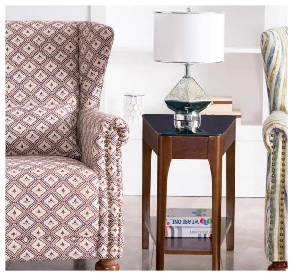 The Obsidian Recliner Oak Wood Wedge Table offers the perfect look for your living room. It boasts streamlined "œaero"� effects like rounded, soft corners, tightly cropped tops and recessed hardware. The thick, black glass table tops glitter with flashing highlights and reflections of home. It features a lower display shelf for storage and is perfectly scaled to fit in most condos/apartments. It comes in a rich, hand applied Chestnut finish and is easy to assemble.Features: • Finish: Chestnut • Overall Product Dimensions 24" H x 24" W x 17" D • Tempered black glass top with radius corners • Contoured hardwood legs add a modern look • Lower display shelf for storage • Apartment scale occupies a small footprint • Simple assembly in minutesSpecifications: • Product Weight: 28 lbs