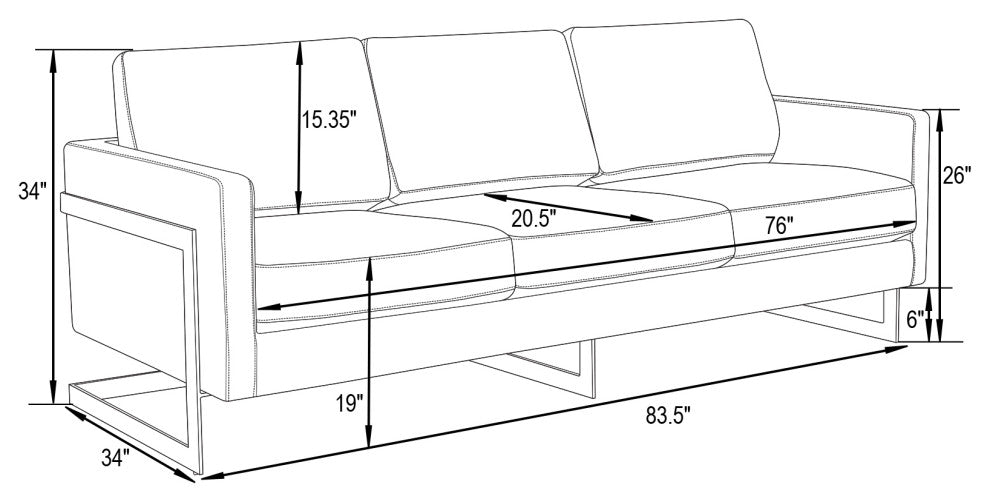Item Specification: The Sofa has space for three people to sit comfortablyThe frame is constructed from sturdy wood with pocket springs for extra comfort and the Base has plastic pads to protect from floor scratchingRemovable Seat and back cushion includedSoft velvet fabric filled with foam makes a comfortable sofa that you can sit on for hoursStrong and durable Stainless Steel Gold Mirrored legsThe stylish attractive design makes this item an amazing match for your homeNo assembly required Leaving you stress-free and with a little extra time on your handsItem Dimensions:Overall 34.25" H x 83.5" W x 34" D.Seat 19" H x 76" W x 20.5" D.Back 15.35" H.Arm 26" H.Leg 6" HItem Description:The Lincoln Collection features a classic style that elicits thoughts of modern elegance and grace. Add glamorous definition to your interior space with a Lincoln Sofa, Designed with simple, modern lines and scaled for use anywhere in your home, the Sofa seating area is covered in an elegant velvet that is set off by the splendid gold metal legs. The chair is built with durability and supportive comfort in mind, from the sturdy hardwood solids in the frame to the stainless-steel legs to the high-density foam and fiber padding in the seat and back. The Sofa brings a regal ambiance to this piece, making this a glamorous addition to your home.