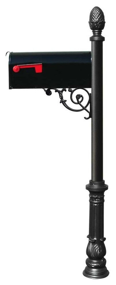 Lewiston post system with E1 Economy mailbox, mounting plate, ornate base and pineapple finial, BlackOur Lewiston Post is made from rust-free cast aluminum with a durable weather resistant finish and comes with a E1 Black Economy Mailbox, support brace with mounting plate, decorative pineapple finial and ornate base. E1 Economy mailbox is made of galvanized steel with a smooth rust-resistant finish, steel latch and red aluminum flag. Post, support brace, finial and base color: Black.Beautiful post with fluted base and ball finialThe post mounts deep down into your lawn or sidewalk and is made from solid cast aluminumProtective, weather-resistant, black powder coated finishIncludes mailbox mounting bracket and support braceComes with E1 Economy mailbox, which is made of galvanized steel with a smooth rust-resistant finish, steel latch and red aluminum flag.Product Dimension: 6.5"x19"x5''2"Color: Black