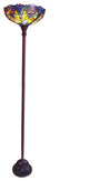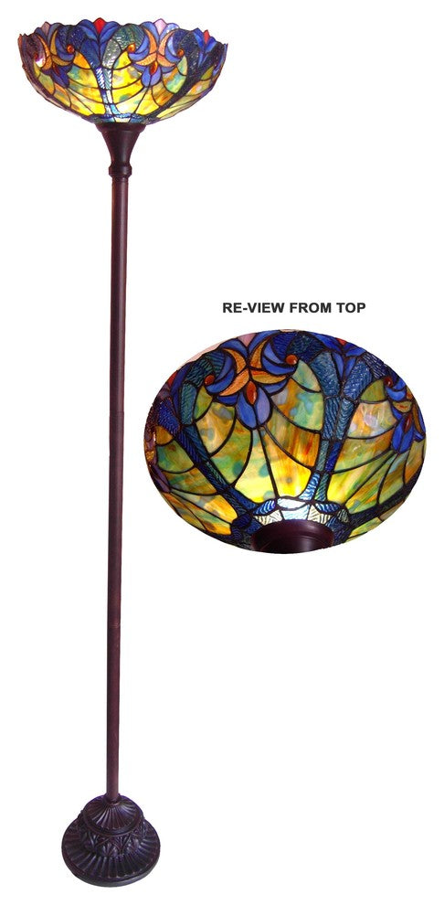 Illuminate your living spaces in classic style with the blue Victorian Tiffany style torchiere floor lamp. With the beauty of Tiffany style glass, this piece glows in dominant blue. The glass is accented with matching cabochons completing the vintage look.