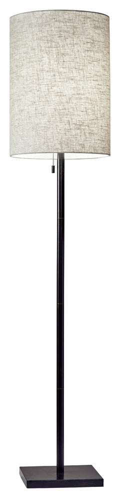 The Liam Floor Lamp is an elegant style that highlights simple materials and a classic silhouette. A thick dark bronze finished metal pole supports a natural textured fabric shade. A tall cylinder shade is contrasted by a compact square shaped metal base. A simple pull chain turns the lamp on and off. Place this floor lamp in your living room for a soft, transitional look.