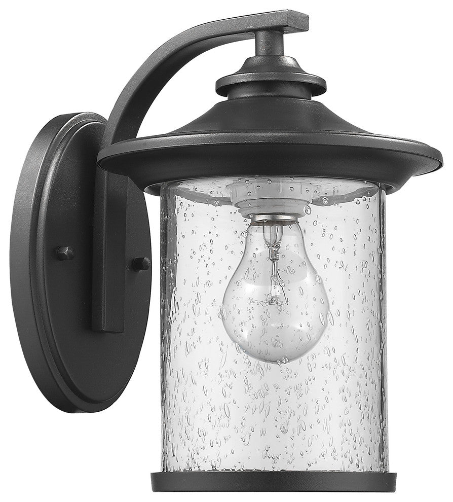 This transitional 1-light outdoor wall light features a painted black finish that will compliment many outdoor decors. The clear seedy glass adds interest to the look and the open bottom makes changing bulbs easy.