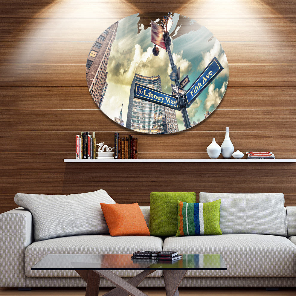 Bring Contemporary Abstraction to your home with this large Circle Metal wall art. This Library Way and 5th Avenue Street Signs Metal Artwork makes it the focal point of any room or office.