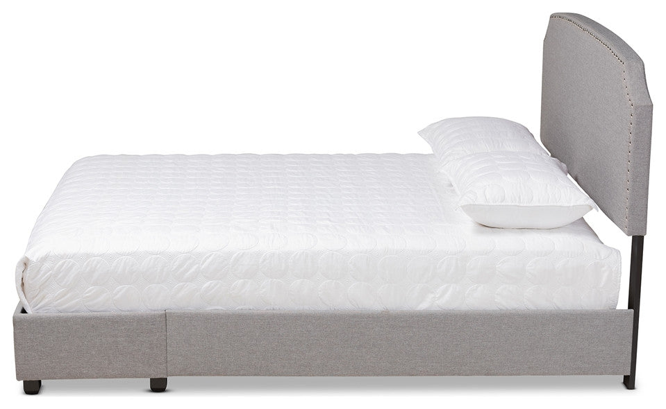 Sweet dreams abound with the bed. This chic bed is upholstered in an elegant linen-like fabric that provides ample comfort for you to lean against as you read or watch TV. The headboard features a scooped silhouette highlighted by glamourous silver studs, giving the piece an air of modern luxury. Black feet complete the look. Stylish and practical, the bed is fitted with two drawers at the footboard with space to store clothes, sheets, and more. The bed is made in Malaysia and requires assembly.- Constructed from MDF wood, rubberwood, and LVL- Upholstered in linen-like polyester fabric and padded with foam- Two (2) drawers- Silver studs- Black feet- Slats eliminate the need for a box spring- Assembly requiredDimensions: 46.26" high x 84.65" wide x 80.12" deep; Headboard: 24.41" wide x 80.12" long x 2.76" thick; Distance between slats: 5.98"; Height from floor to top of slat: 10.63" high