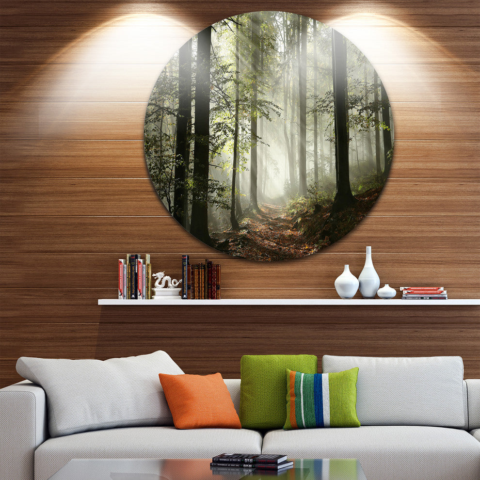 Bring Contemporary Abstraction to your home with this large Circle Metal wall art. This Light in Dense Fall Forest with Fog Metal Artwork makes it the focal point of any room or office.