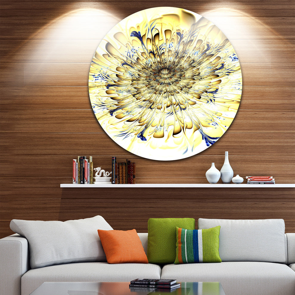 Bring Contemporary Abstraction to your home with this large Circle Metal wall art. This Light Yellow Digital Art Fractal Flower Metal Artwork makes it the focal point of any room or office.