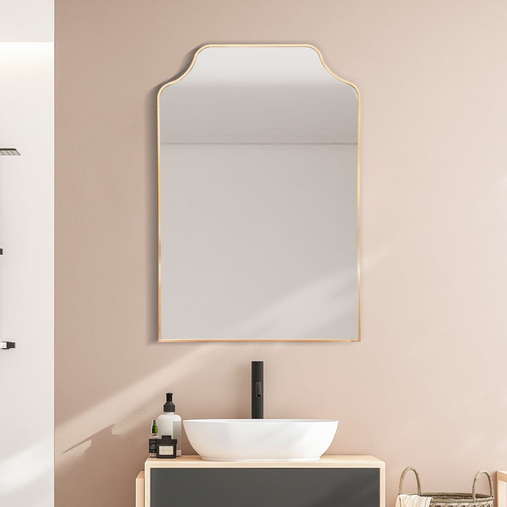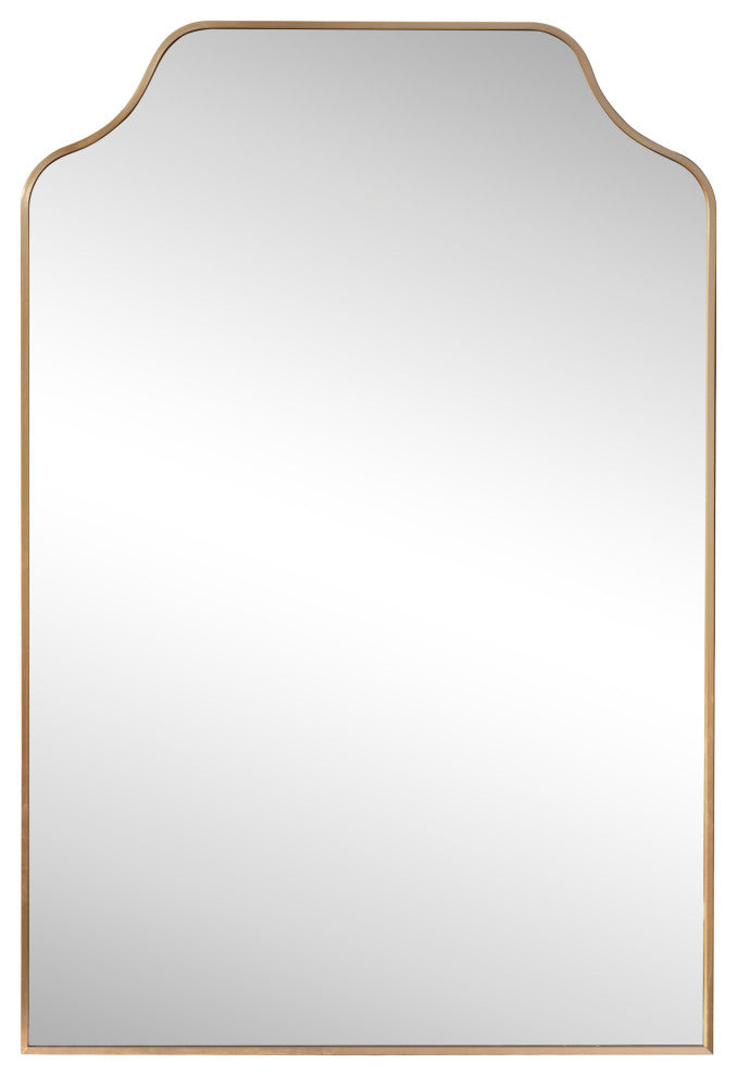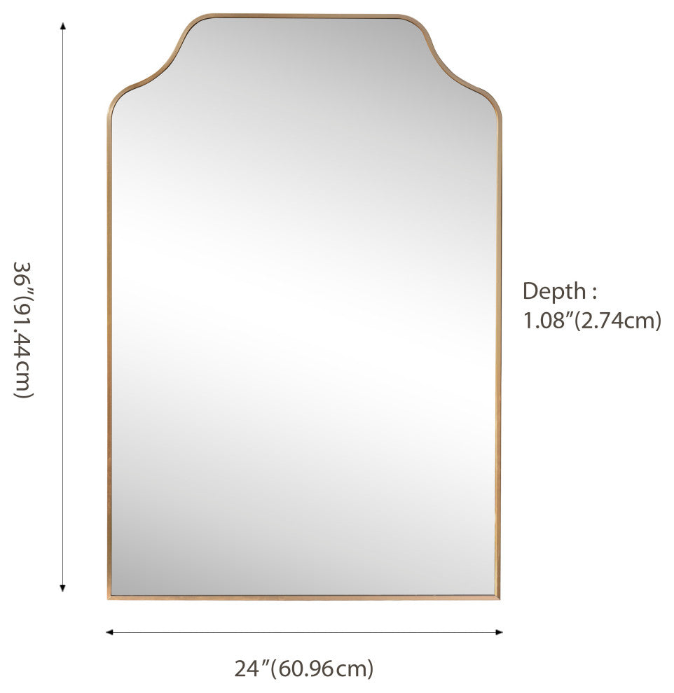 The classic scalloped corners of this modern mirror adds a vintage vibe to any space. This versatile wall-hung or leaning design is strengthened by a narrow metal frame. Its vertical orientation is ideal for a bathroom vanity, bedroom or living area.Features:• Mirrored glass has a minimalist gold metal frame• Contemporary 24" wide design visually expands your space• Add vintage style to a bedroom or living room with the Louis-style curves of this versatile mirror• Hanging device: MDF backboard•  with • Mirror Orientation: Vertical• Body Material: Metal• 36 inches high x 24 inches wide x 1.08 inches deepAbout us:You see an ordinary mirror.We see an enhancement to help with making your fashionable statement.A perfectly smooth-edged frame with LED lighting and uniform surface casts a flaring reflection of the subject and surroundings. Our vast mirror catalog includes a variety of designs, shapes and sizes.JONATHAN Y Lighting - a fashion revolution in home decor.