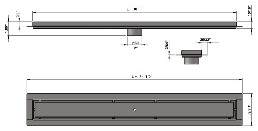 Royal Tile Insert Linear Shower Drains by Serene Steam 5 Unique Designs Available: Wind Design, Wave Design, Square Design, Broken Lane Design, Tile Insert Design. Approximate size: 16", 24", 30", 35", 39", 47", 59".Set Includes Channel body, tile insert grade, drain rubber fitting, drain puller key, waterproofing membrane sheet around the drain flange (not require but included), Installation Instruction.Royal drains are sized to match standard 1/2 Inch, 1 Inch, 2 Inch, and 4 Inch tile without cutting. When cutting is needed, cuts are straight saw cuts. No grinding to match a radius. Consider how much easier glass mosaics will be to install.Approximate dimensions available:Length 15 3/4" x 2 3/4" (400mm) Intake sq. in: 12.38.Length 23 1/2" x 2 3/4" (600mm) Intake sq. in: 14.96.Length 30" x 2 3/4" (762mm) Intake sq. in: 17.62.Length 35 3/8" x 2 3/4" (900mm) Intake sq. in: 20.03.Length 39 3/8" x 2 3/4" (1000mm) Intake sq. in: 21.12.Length 47 1/4" x 2 3/4" (1200mm) Intake sq. in: 26.68.Length 59" x 2 3/4" (1500mm) Intake sq. in: 31.67.The shower channel Grade is grade 16 gauge 304 stainless steel.Bodies are fully welded and leak tested prior to dispatch.2 Inch diameter central vertical outletPre-Slope ChannelChannel width: 2 3/4 Inch (70 mm)Electro polished finish.Stainless steel clad flexible coupling connects outlet to pipe system (optional).Flow rate: at entrance of shower 6.3GPM (0.4 l/s); against the wall 9.5GPM (0.6 l/s).Compatible with tiles up to 10mm depth (14mm lip).Flange Body Edge designed for use with any and all type of waterproofing, included and not limited hot-moppainted or liquid membranes, Sheet Membrane, Vinyl waterproofing etc.Optional add ons: LED lights: Green, Blue, Red and Multi-color. Stainless Steel Hair Trap.Return Policy: Item ships in perfect condition. Returns accepted within 14 days. Customer pays return shipping and delivery cost.
