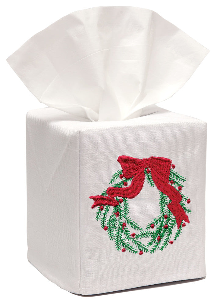 Linen Tissue Box Cover, embroidered with the Christmas Wreath. Made by Zulu women in South Africa. Slips easily over Kleenex and Puffs cube tissue boxes.