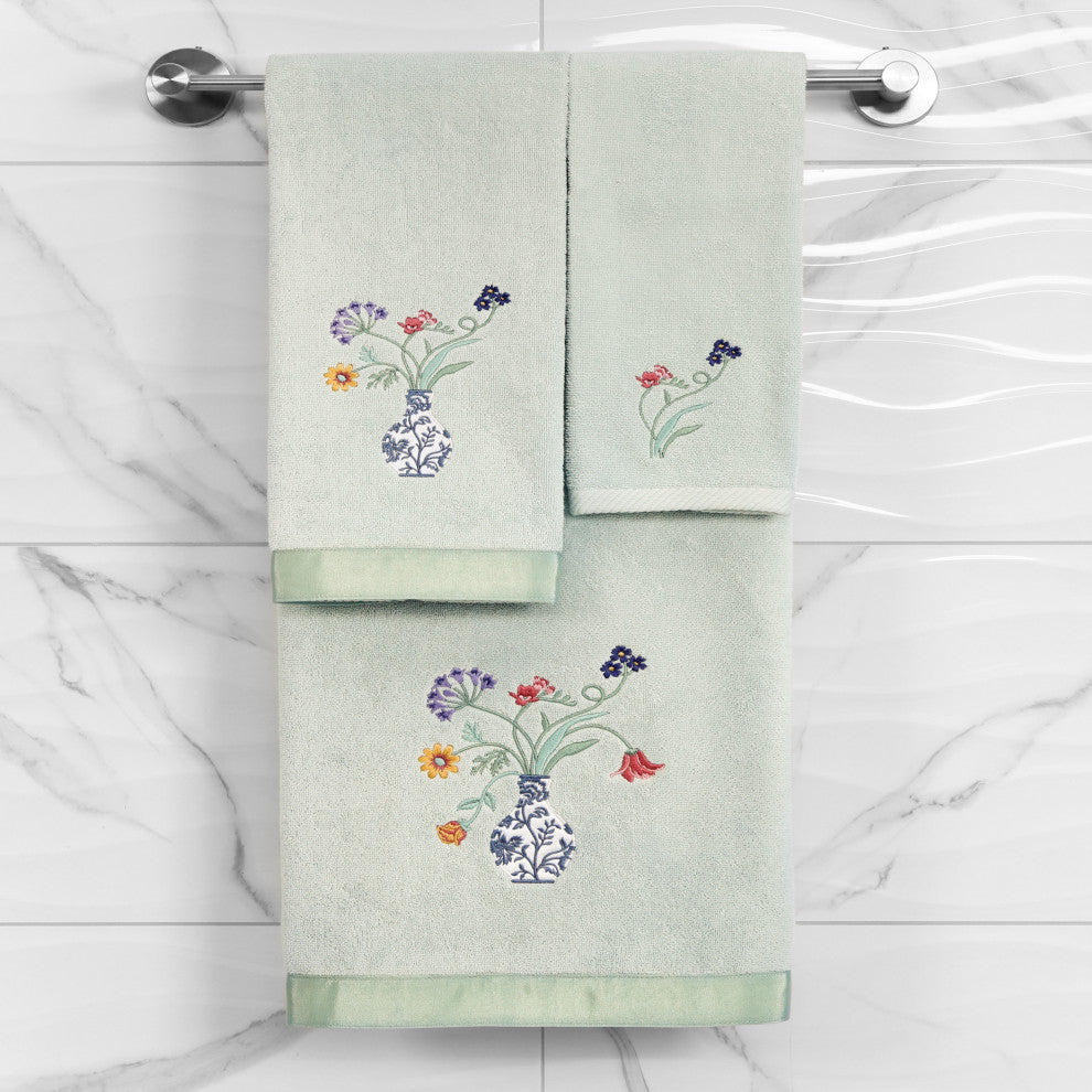Your decorations are not complete without charming embroidered towels for the comfort of your family and guests. The STELLA towels feature lovely flower stems in an applique blue and white vase and are trimmed with a lustrous bengaline border. Cloud soft and super absorbent, these luxurious, durable towels keep their plush appearance after washing. This collection is available in 8 elegant colors: White, Beige, Blush, Aqua, Silver, Cocoa, Charcoal and Marine. The STELLA Towel Collection brings cottage spirit and richness to your home decor and makes a great gift!Note: Due to variations in computer screen resolutions, slight color differences may exist between images provided and actual product. Embroidered Flower and Vase design 100% Premium Turkish Cotton Superbly absorbent and quick drying Available in 8 elegant colors Machine wash cold, No bleach, line dry or dry clean Set includes 2 hand towels (16" x 30") Made in Turkey Proudly Embellished in USA