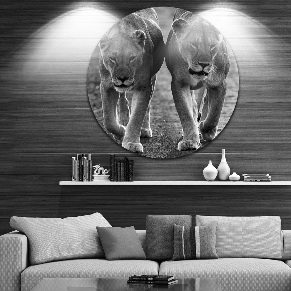 Lions In Black And White, Animal Photo Disc Metal Artwork, 38"
