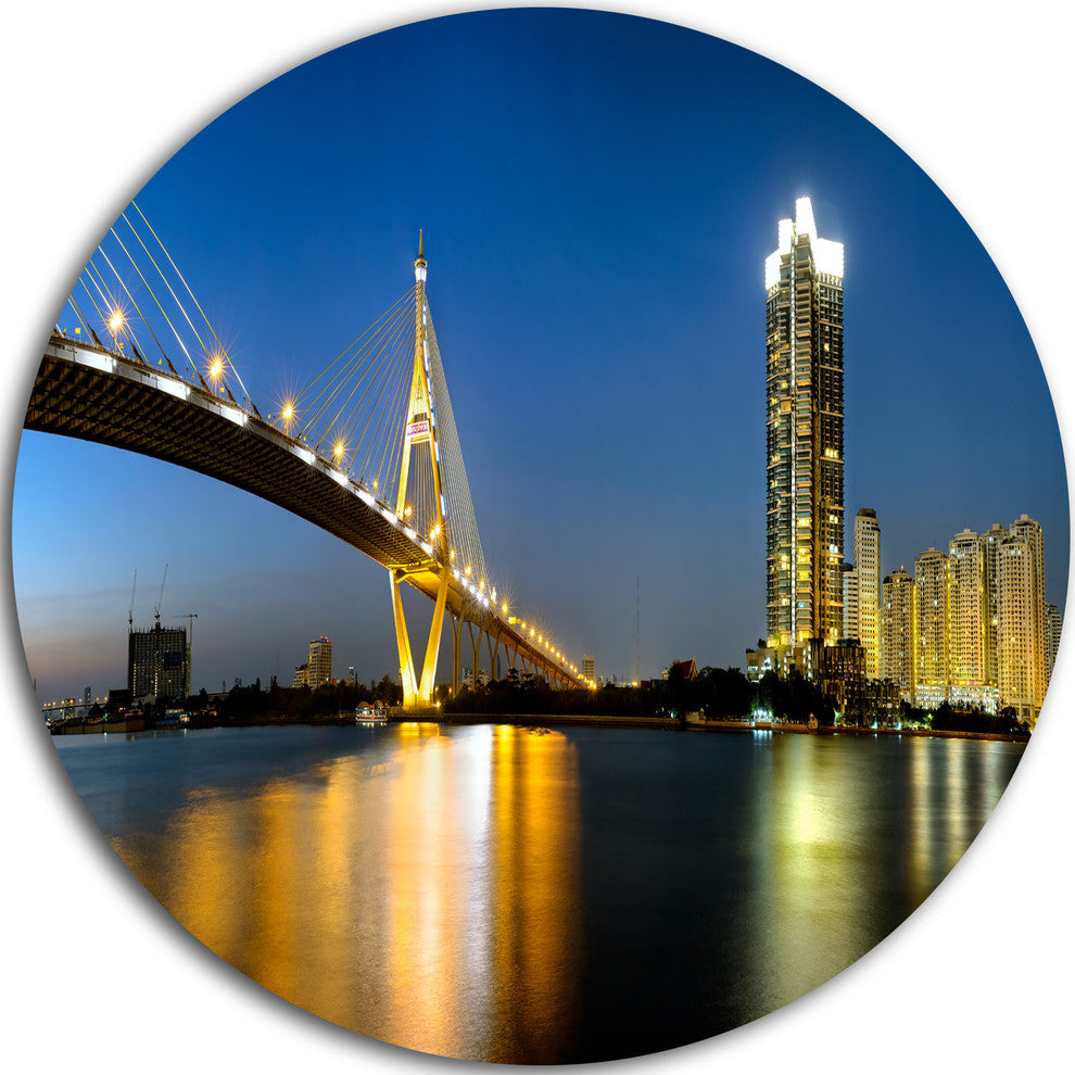 Bring Contemporary Abstraction to your home with this large Circle Metal wall art. This Lit-up Bhumibol Bridge at Dusk Metal Artwork makes it the focal point of any room or office.