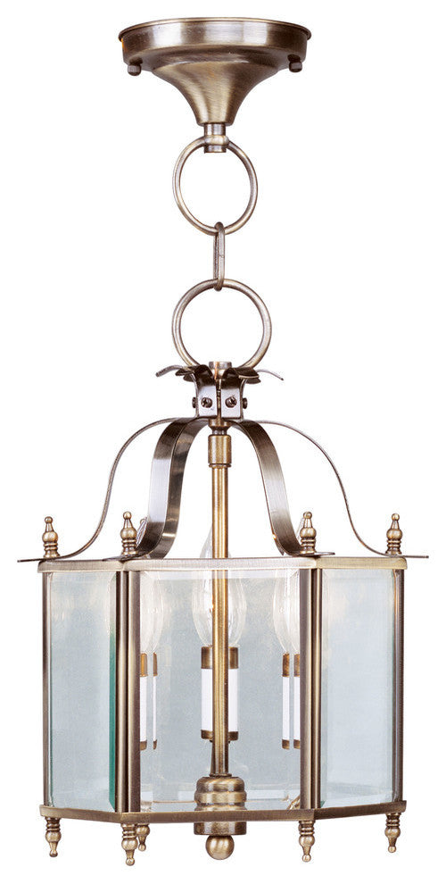 The Livingston collection features a classic six-sided lantern silhouette. antique brass finish with clear beveled glass gives the fixture charming style and the candelabra bulbs will fill your home with generous amounts of illumination that welcomes your guests. The versatile ixture can be transformed into semi-flush ceiling mounts. Additional Product Information: Collection: Livingston Item Finish: Antique Brass Style: Traditional Glass/Shade Type: Clear Beveled Glass Diameter (inches): 10" Height (inches): 15.25" Number of Bulbs: 3 Bulb Base Type: Candelabra Base Max Wattage (Watts): 60 Chain (inches): 3'' Wire (inches): 8'' Canopy Size (inches): 4.5" Dia Suitable For Dry Locations?: Yes Suitable For Damp Locations?: Yes Suitable For Wet Locations?: No Can be Uplight or Downlight?: No Material: Steel Country: China