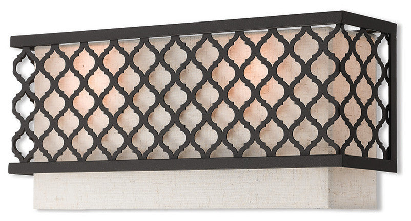 Our Arabesque two light wall sconce will add refined style and a hint of mystery to your decor. The oatmeal fabric hardback shade creates a warm illumination, while the light brings to life the intricate English bronze cutout pattern.