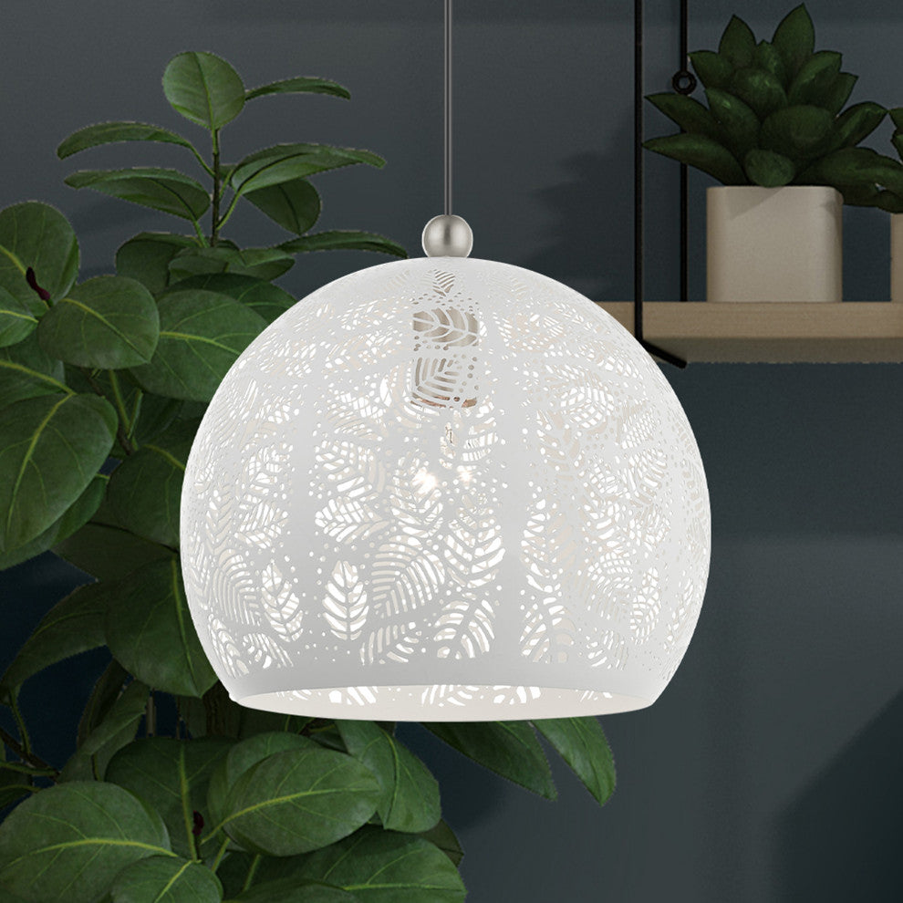 Chantilly features a beautiful white finish with brushed nickel finish accents. Light artfully reflects and refracts through the filigreed leaves to provide a dramatic focal point to any room. This small one-light pendant will add an unmistakable touch of elegance to your dining room, kitchen or a bedroom.