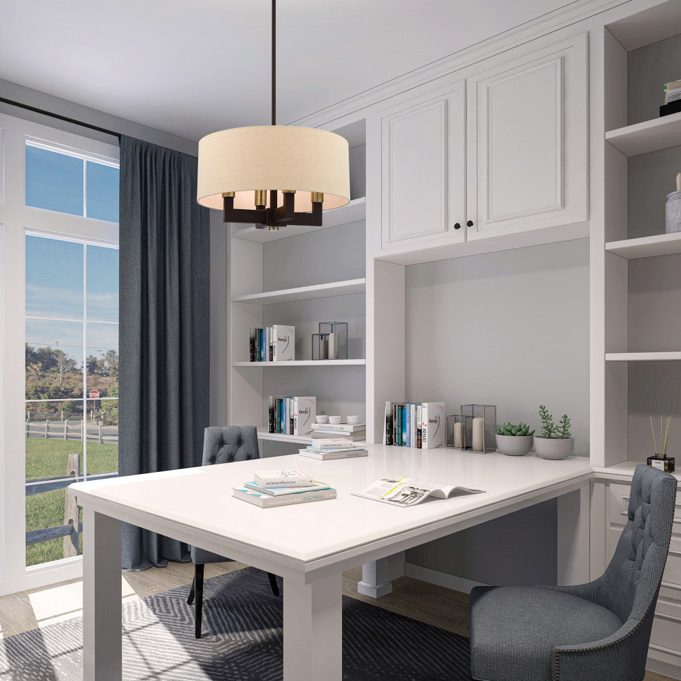 The Cresthaven collection has a clean, crisp look and contemporary appeal. The hand-crafted parchment color linen fabric hardback shade offers a diffused warm light. This bronze finish with antique brass finish accents four-light pendant chandelier has sleek exposed angular arms making it tasteful to elevate your style. Will adapt well in the living room, dining room and bedroom.