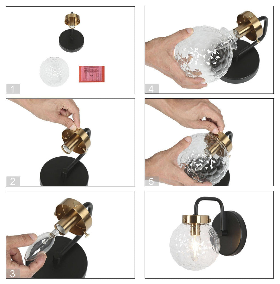 At LNC, we always believe that Classic is the Timeless Fashion, Liveable is the essential lifestyle, and Natural is the eternal beauty. Every product is an artwork of LNC, we strive to combine timeless design aesthetics with quality, and each piece can be a lasting appeal. The Anteros collection is aiming at offering a variety of functional as well as beautiful modern lighting fixtures for your home decoration. Simple and modern design carrying with a high-end electronic-gold finish and frosted glass lampshade, all of the Anteros collection fixtures could light up and dress up your room in a good way.Features:Model: LMMAY6B04W1B8CMaterial: Metal/GlassColor: Black, GoldStyle: Modern/ContemporaryFinish: Matte Black and Polished GoldProduct Dimension: 5.5"W x 7.5"D (Depth) x 9.8"HBack Plate Dimension: 5"W x 1"HShade Material: Textured GlassShade Color: ClearShade Shape: GlobeLocation: Damp (bathroom suitable)Dimmable: Yes, when used with dimmer switch and dimmable bulbsKey Features:Bulb Type: B10 LED/IncandescentBulb Base: E-12Maximum Wattage: 40WNumber of Bulb: 1Bulb Included: Not IncludedVoltage: 120VMount Type: Wall MountAssembly Required: YesMounting Accessory Included: YesPower Source: HardwiredProfessional installation recommended