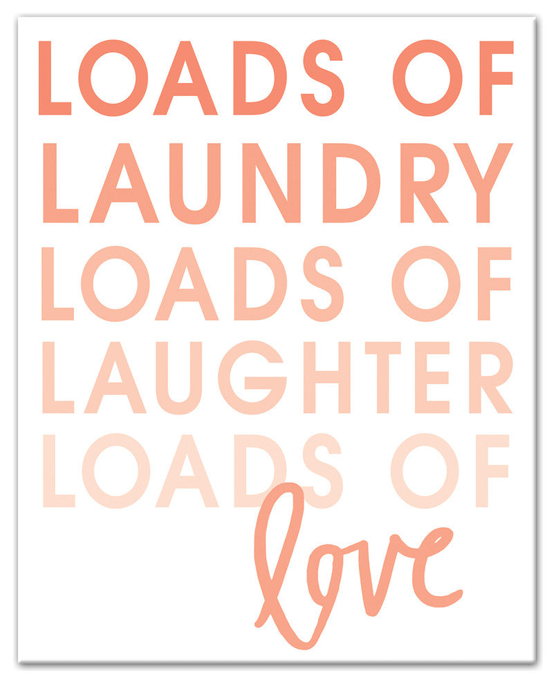 The Loads of Laundry, Laughter, and Love Coral Canvas Wall Art, 8x10 from our Laundry Collection shows a cute laundry saying in coral text on a white background. This canvas helps you create a fun, unique space in your laundry room. This wall art comes built ready to hang and is printed on professional grade tightly woven canvas with durable construction and finished backing. The result is irresistible artistry that ensures a lasting impact on your home.