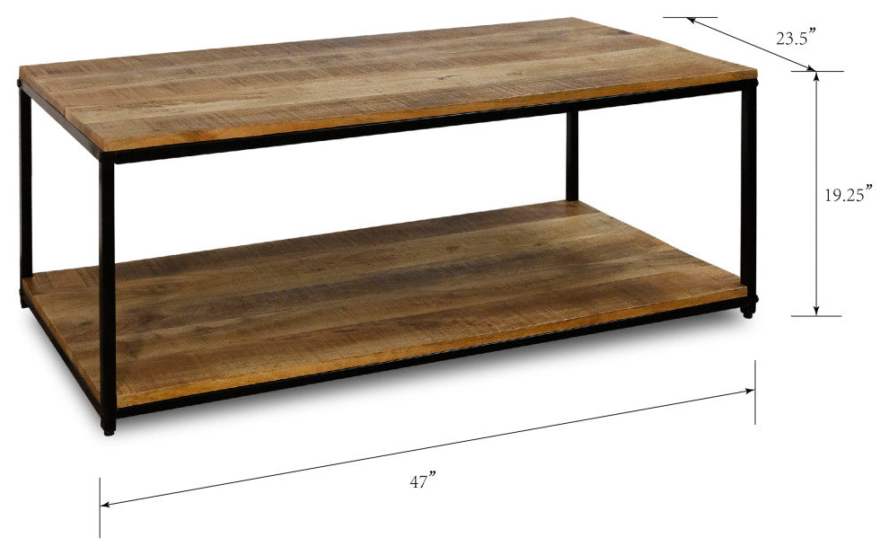 Complete with an rectangular shape, black iron frame, and chattercut wood finish, the Logan coffee table features a simple design that''s versatile for any space. It has an extra lower shelf for extra storage and stands at 24" tall. Ideal for transitional spaces, this console table looks great in the living room.Features:DUE TO THE PRODUCTION PROCESS, EACH PIECE IS UNIQUE AND NO TWO ARE EXACTLY ALIKETHIS COFFEE TABLE IS COMPOSED OF AN OPEN DESIGN WITH CHATTERCUT WOOD DESIGN ON THE ON ALL SIDES OF THE SHELVES AND TABLE TOP.THIS COFFEE TABLE IS FINISHED ALL OVER IN A NATURAL CHATTER CUT MANGO WOOD FINISH, WITH A GUN METAL POWDER COATED IRON FRAME and LEGS.THIS COFFEE TABLE IS DESIGNED IN THE SHAPE OF A RECTANGLE.THERE IS ONE LOWER SHELF, AMD ONE TABLE TOP DESIGNED INTO THIS COFFEE TABLE.THIS COFFEE TABLE STANDS 24" IN HEIGHT.Due to lighting and monitor differences, actual colors and finishes may vary slightly from what appears online.