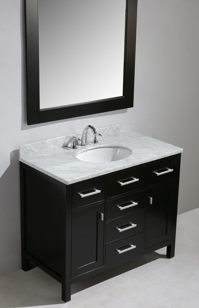 Design Element goes the extra mile in its construction of bathroom furniture by using solid oak throughout. This 42 in. single vanity in espresso from the London collection not only oozes class and sophistication. The ample storage in this free-standing vanity includes five fully functional drawers and each accented with brushed nickel hardware.