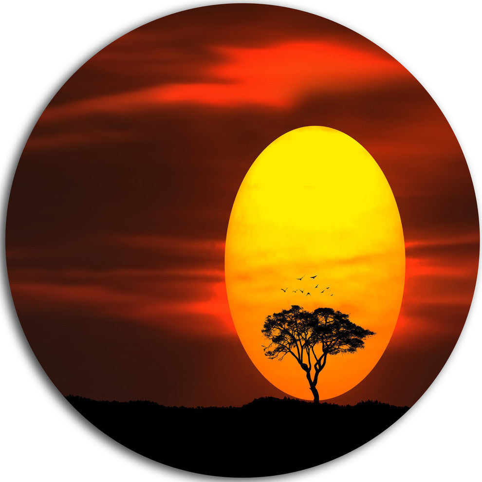 Bring Contemporary Abstraction to your home with this large Circle Metal wall art. This Lonely Tree with Birds at Sunset Metal Artwork makes it the focal point of any room or office.