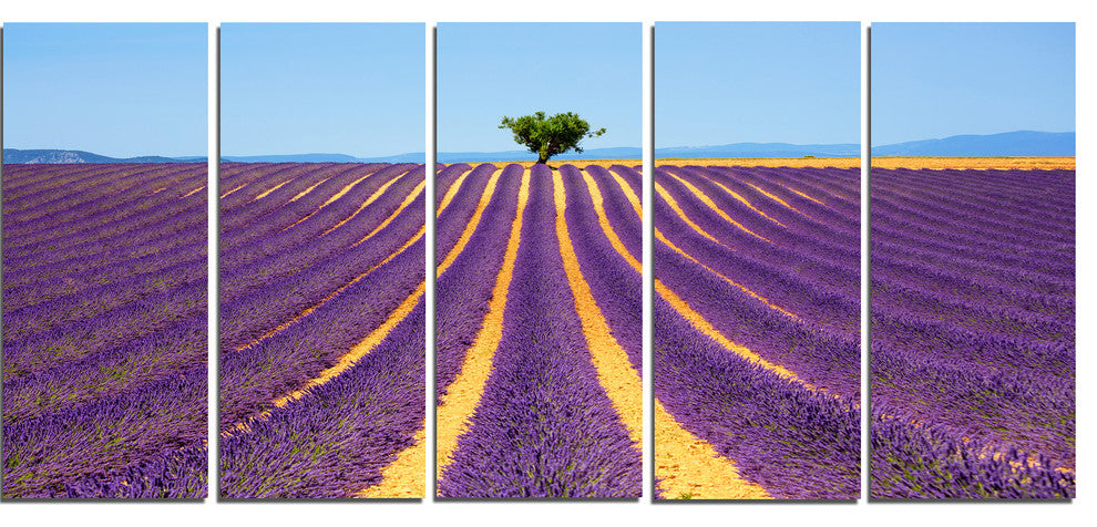 "Lonely Uphill Tree in Lavender Field" Landscape Wall Art, 5 Panels, 60"x28"