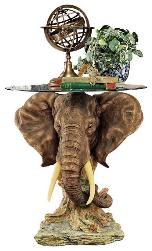 • Note• Accessories not includedCustomers loved the elephant trophy wall sculpture from the Houghton Estate in the north of England so much that they requested a table too! Complete with faux ivory tusks, this pachyderm is cast in designer resin so realistically detailed that guests will wonder if it s an actual British colonial relic. An 18" dia. beveled glass top allows the timeless trophy to be admired from any angle. 18"dia.x20"H. 26 lbs.