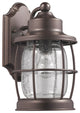 This transitional 1-light outdoor wall light features a rubbed bronze finish that will compliment many outdoor decors. The clear seedy glass adds interest to the look and the open bottom makes changing bulbs easy. Sturdy cast aluminum construction.