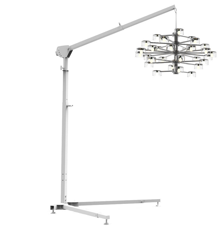Our Los Angeles factory designed and built this one of a kind solution for hanging a chandelier or pendant light in any room. It''s slim, minimalist appearance makes it appropriate as a permanent fixture in a modern home, or it can be fully collapsed and transported, perfect for event production companies. We use 14 gauge American-sourced steel, American labor and inspect every unit before it leaves the factory. FEATURES:5 tilt anglesEight height positions up to 12 feetPole arm length 3-6 feetBase legs extend 3-6 feet360 degree rotationAdjustable premium quality glidersSimple, reliable pull-pin technologyFully collapsableQuick setup and breakdownLooks great as a permanent fixtureWhat''s Included:Main postTelescopic legsTelescopic arm boomBasex4 glider feetx3 adjustment handlesx2 pop-pin locksx6 38" locktight nutsx5 2" bolts, 3/8" threadUtility hook boltPre-stripped power cordPair of wire splicing lugsInstructions
