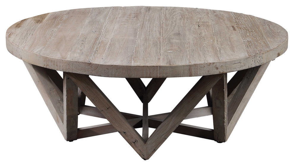 Constructed From Reclaimed Elm Wood, This Cocktail Table Features Natural Wood Grain And Rustic Texture With A Geometric, Triangle Base. Solid Wood Will Continue To Move With Temperature And Humidity Changes, Which Can Result In Small Cracks And Uneven Surfaces, Adding To Its Authenticity And Character.• 48" dia x 17.5"H. Weighs 117 lbs.• Hand Finished Reclaimed Elm• Sturdy enough to hold heavy objects safely.• Heirloom Quality - Expertly hand crafted and hand finished. Due to the hand crafted nature of this piece, each piece may have subtle differences.