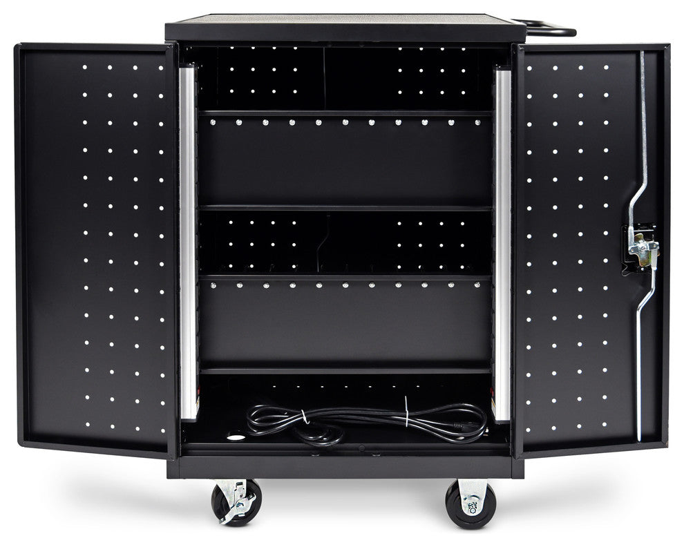Functionality meets durability with a Luxor Laptop / Chromebook Charging Cart. Lockable steel doors and rolling casters provide a rugged security/storage solution that''s easy to move. And with an electrical assembly and cord management system built inside the back of the unit, you''re able to organize and charge multiple devices at once - from laptops to Chrome books. Rubber-coated dividers won''t scratch devices and help provide impact protection during transit. And assembly is simple just attach the casters and handle and you''re ready to roll.
