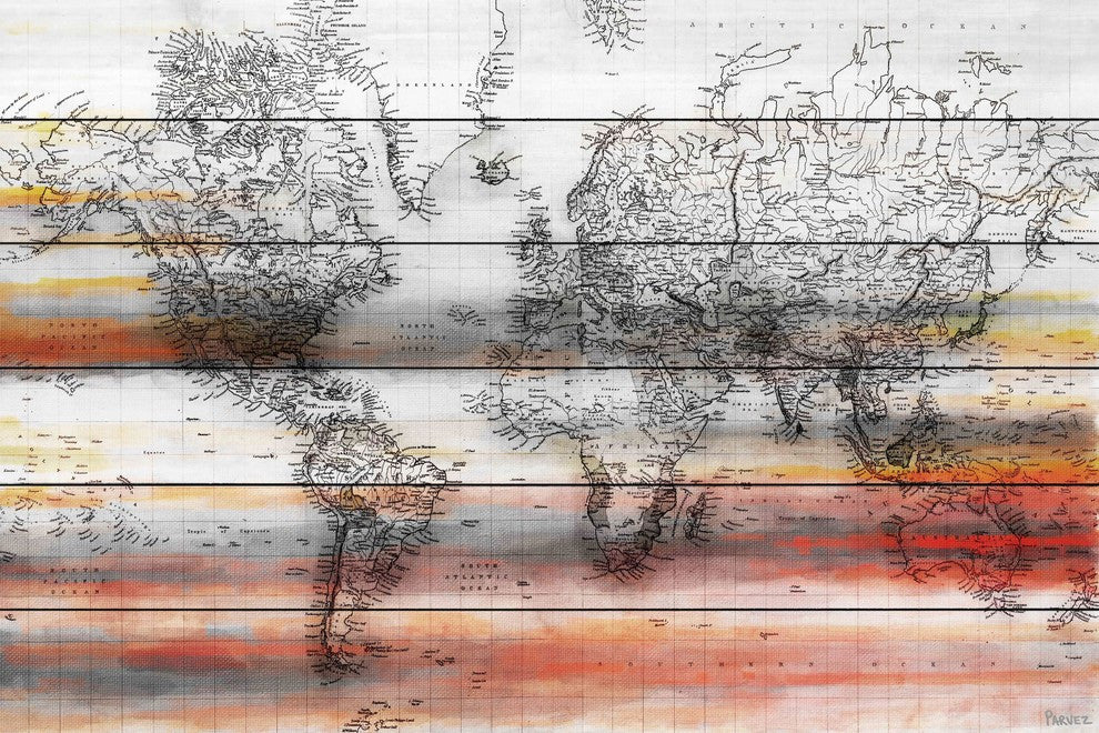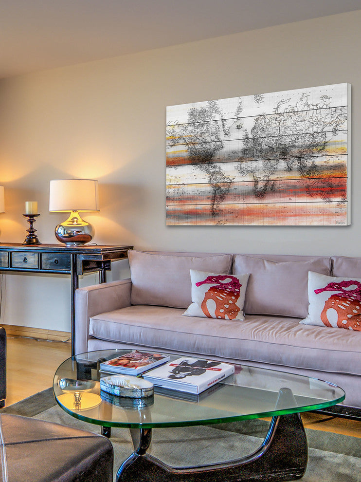 Striking and unique, the "Maailma" Print on White Wood by Parvez Taj will bring your walls to life. Printed on white wood, this 60 inch wide by 40 inch tall contemporary artwork will make a statement in any living room, dining room, or bedroom.- Fine art UV ink print on white wood by Parvez Taj- wood pieces are hand-selected by Fine craftsmen for printing- Arrives ready to hang- Includes a certificate of authenticity- Artist signature on the front