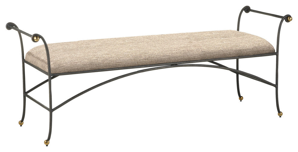 The Mabel Bench is a classic design constructed of textured steel, which has a light gold rub that shows through. Special accents are the polished brass stainless steel ball feet and arm details, as well as the way the stretchers arc up toward the seat. The upholstered top is covered in a woven brown-beige performance fabric, and the seat is a generous 55 inches wide.