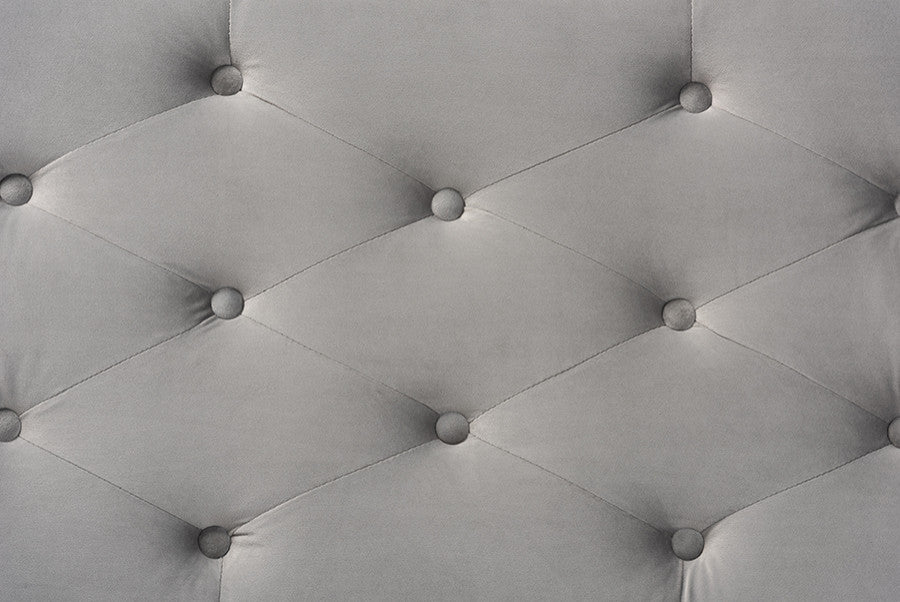 Baxton Studio Mabel Modern and Contemporary Transitional Grey Velvet Fabric Upholstered Silver Finished Storage Ottoman Accommodate your living room needs with the functional utility and luxurious style of the Mabel ottoman. Made in China, the Mabel features elaborate button tufting for a touch of modern style. Padded with foam underneath a layer of lavish velvet, this piece is soft to the touch and designed to maximize comfort. The Mabel requires assembly and is raised to a practical height by four silver metal legs at each corner. This versatile piece can be used as a footrest or as extra seating, all while acting as a storage cabinet for busy areas.