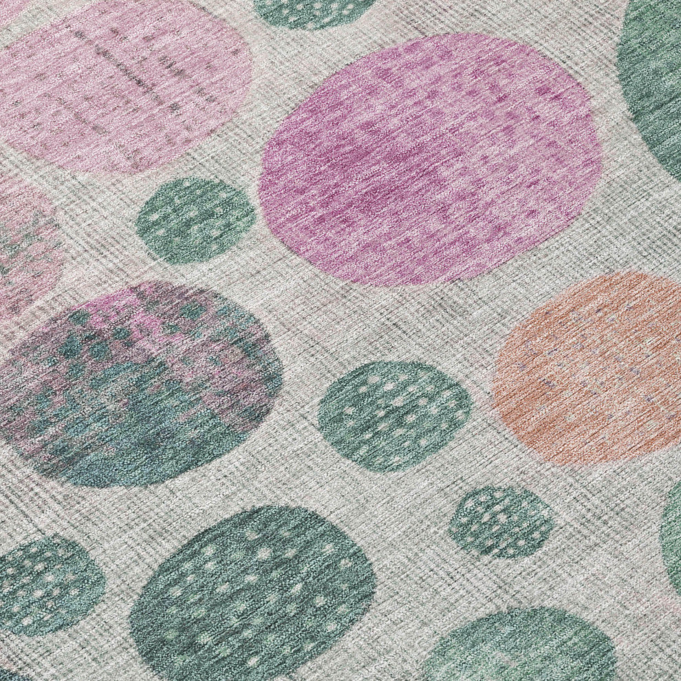 Bring a touch of style to your interiors and exteriors with this transitional rug, offering a captivating geometric design of spontaneous, free-form circles. Constructed with UV stabilization, this rug stands resilient against time and elements. Its ultra-thin build featuring a non-skid backing removes the hassle of additional padding, while its machine washable quality makes it friendly for families and pets.