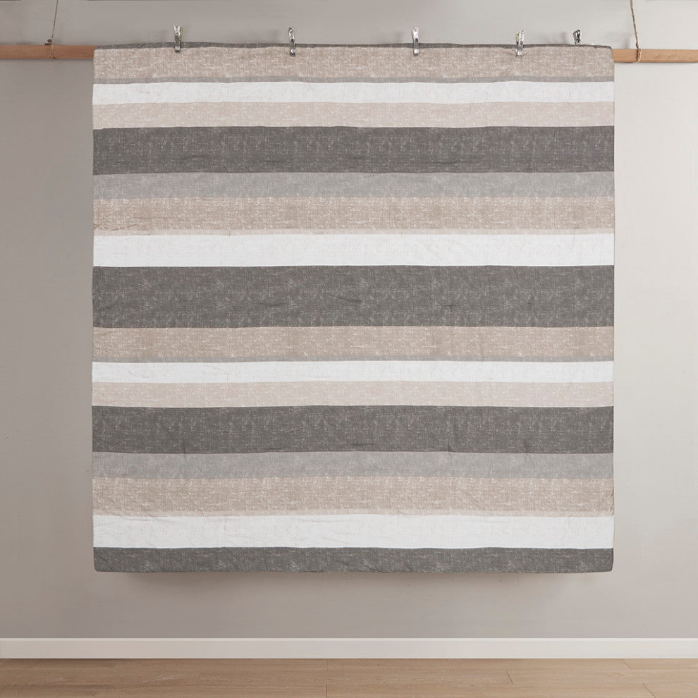Revamp your bedroom style with the Madison Park Essentials Jaxon bed in a bag. This modern comforter set features a stripe pattern in alternating grey, white, and taupe colors that''s pair with a solid grey reverse to create a casual vibe. The included sheet set has a coordinating stripe design to complement the soft and cozy comforter''s look. Included in the set is 1 comforter, 2 shams (1 in Twin), 1 flat sheet, 1 fitted sheet, and 2 pillowcases (1 in Twin). The fitted sheet fits up to 14"(12"for Twin size) mattress depth. This machine washable bedding set is OEKO-TEX certified and features an antimicrobial treatment, which inhibits bacteria growth and keeps the bedding fresher for longer. Totally refresh your space without breaking the bank with this complete comforter set with bed sheets.FEATURESBed in a Bag Set includes comforter, 2 shams (1 in Twin), 1 flat sheet, 1 fitted sheet, 2 pillowcases (1 in Twin)Soft brushed microfiber print comforter and shams; 100% Polyester fillingStripe comforter look in taupe, greys, charcoal for casual and modern bedroom style with simple coordinating stripe design on sheet setFitted sheet fits up to 16"(14"for Twin size) mattress depth, comes fully elasticized for better coverage and fitMachine washable and spot clean fabric (See care label)Commercial washer and dryer recommended to provide ample room for movementItems may come in compressed packaging to ensure efficient shippingItems will need to be fluffed up and steam ironed if compressedHypoallergenic polyester comforter filling contains no allergens and is dust proofOEKO-TEX labeled textile certified as safe on skinAntimicrobial treatment to keep the bedding/linen fresher for longer by inhibiting bacteria growthMATERIALSComforter/Shams: 100% polyester soft brushed microfiber, printed.Filling: 100% polyesterSheet Set: 100% polyester microfiber, printedSIZE 1 Comforter:104"W x 92"L2 King Shams:20"W x 36"L (2)1 Flat Sheet:108"W x 102"L1 Fitted Sheet:78"W x 80"L + 14"D2 Pillowcases:20"W x 40"L (2)