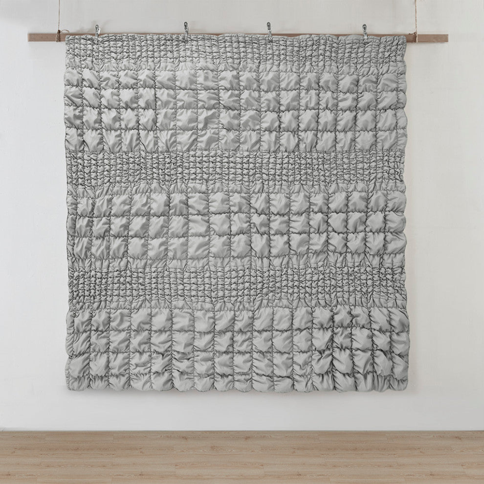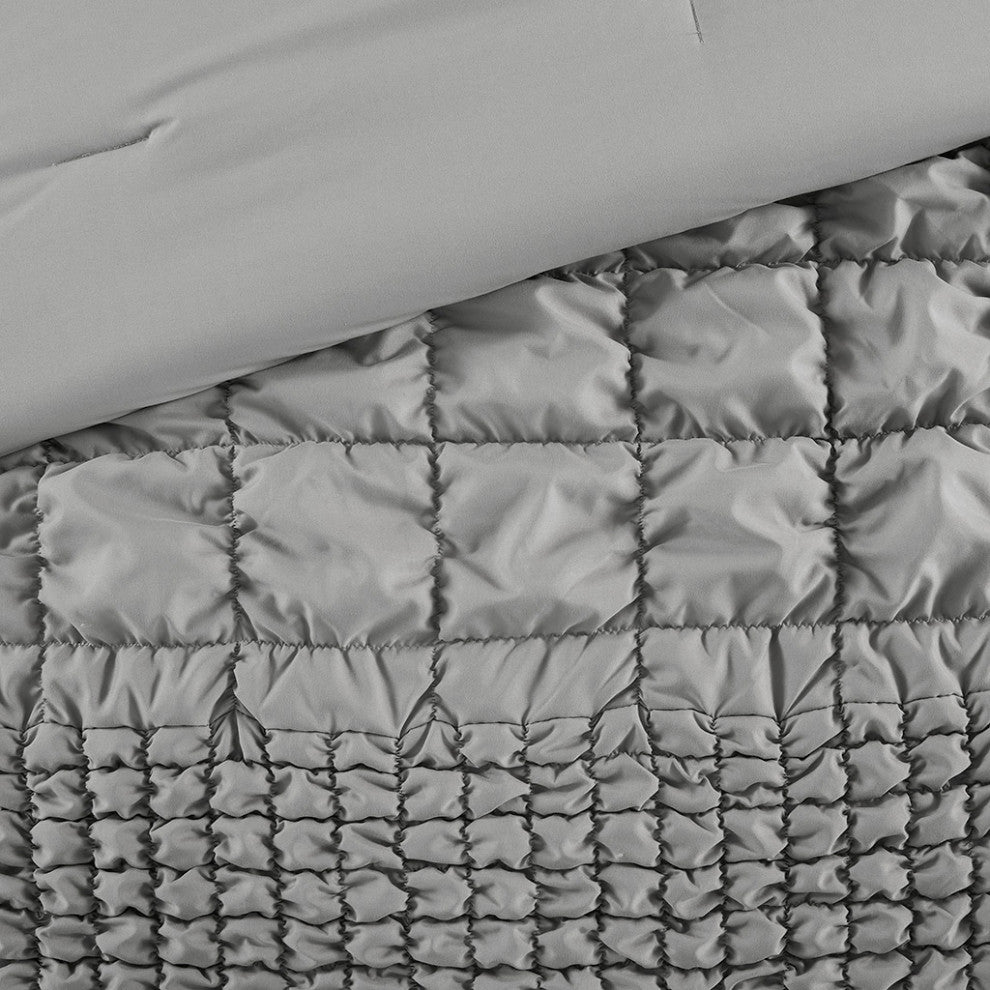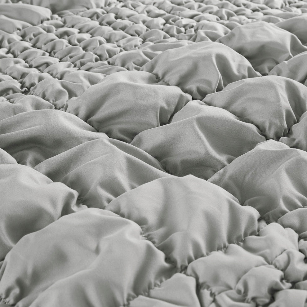 This shabby chic cottage style comforter set features elastic embroidery creating both small and large square shaped ruching, giving the bedding set a stylish puffy appearance. Also included are two matching shams featuring small ruching to complete the look. Available in multiple colors: soft white and warm grey. Made of super soft microfiber and 100% hypoallergenic polyester filling for a comfortable night''s sleep.FEATURESSet includes comforter, 2 matching shams100% soft microfiber; 100% Polyester fillingLarge and small ruching in horizontal stripe layout created by elastic embroideryMachine washable in large capacity commercial washer/dryerHypoallergenic polyester comforter filling contains no allergens and is dust proofGently stretch the item to retain its original size if product elasticity contractsMATERIALSComforter/Sham: Solid microfiber, elastic embroidery face, solid microfiber reverseFill: 100% polyester fillSIZE 1 Comforter:102"W x 90"L2 King Shams:20"W x 36"L (2)