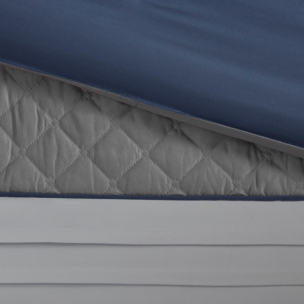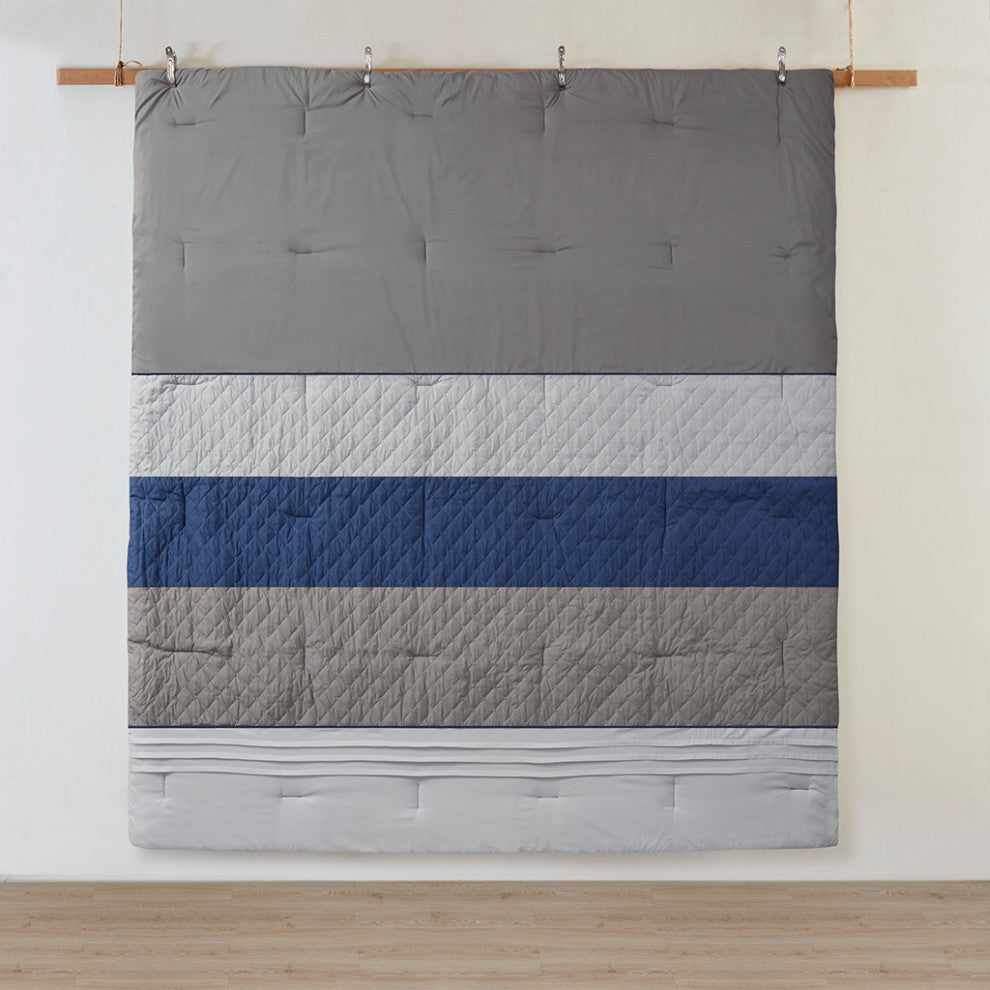 Perfect update to the bedroom, this transitional microfiber comforter set features printed and pinsonic techniques pieced together in a striped colorblock design. The three throw pillows are embellished with embroidery, piecing and more pinsonic techniques. A matching bed skirt is included to complete the look. This bedding set is available in a grey and blue combination or a spice, taupe, oatmeal combination. The comforter and pillows are filled with hypoallergenic polyester filling that is dustproof, ensuring a restful and comfortable sleeping experience. This OEKO-Tex certified bedding set can also be machine washed and is extra durable for long lasting comfort.FEATURESSet includes 1 comforter, 2 shams, 1 bed skirt, and 3 throw pillowsMade of microfiber fabric, piece pinsonic face, and polyester fillingPieced stripe color block with printed and pinsonic areas featuring grey and blue colorsThree throw pillows with pinsonic, piecing, and embroidery techniques15" drop bed skirt, with split cornersMachine washable and spot clean fabric (See care label)Commercial washer and dryer recommended to provide ample room for movementItems may come in compressed packaging to ensure efficient shippingItems will need to be fluffed up and steam ironed if compressedHypoallergenic polyester comforter filling contains no allergens and is dust proofOEKO-TEX labeled textile certified as safe on skinMATERIALSComforter/Sham: Solid soft microfiber, pieced pinsonic face, solid microfiber reverseFill: 100% polyesterPillow: Microfiber cover with polyester fillBedskrit: Microfiber drop, non-woven platformSIZE 1 Comforter:104"W x 92"L2 King Shams:20"W x 36"L (2)1 Bedskirt:72"W x 84"L + 15"D1 Square Throw Pillow:18"W x 18"L1 Oblong Throw Pillow:12"W x 18"L1 Square Throw Pillow:16"W x 16"L